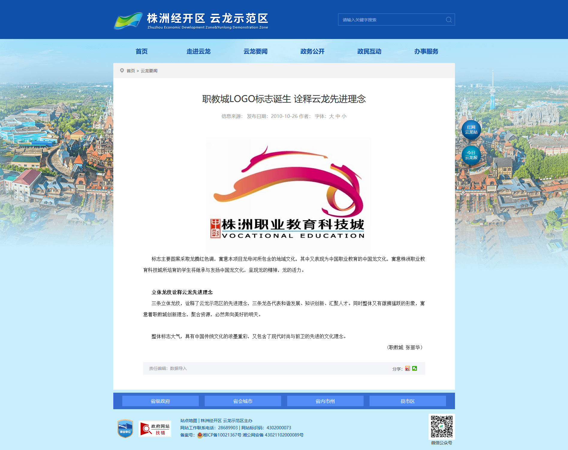 标志主要图案采取龙腾红色调,寓意本项目龙母河所包含的地域文化,其中又表现为中国职业教育的中国龙文化,寓意株洲职业教育科技城所培育的学生将继承与发扬中国龙文化,呈现龙的精神,龙的活力。