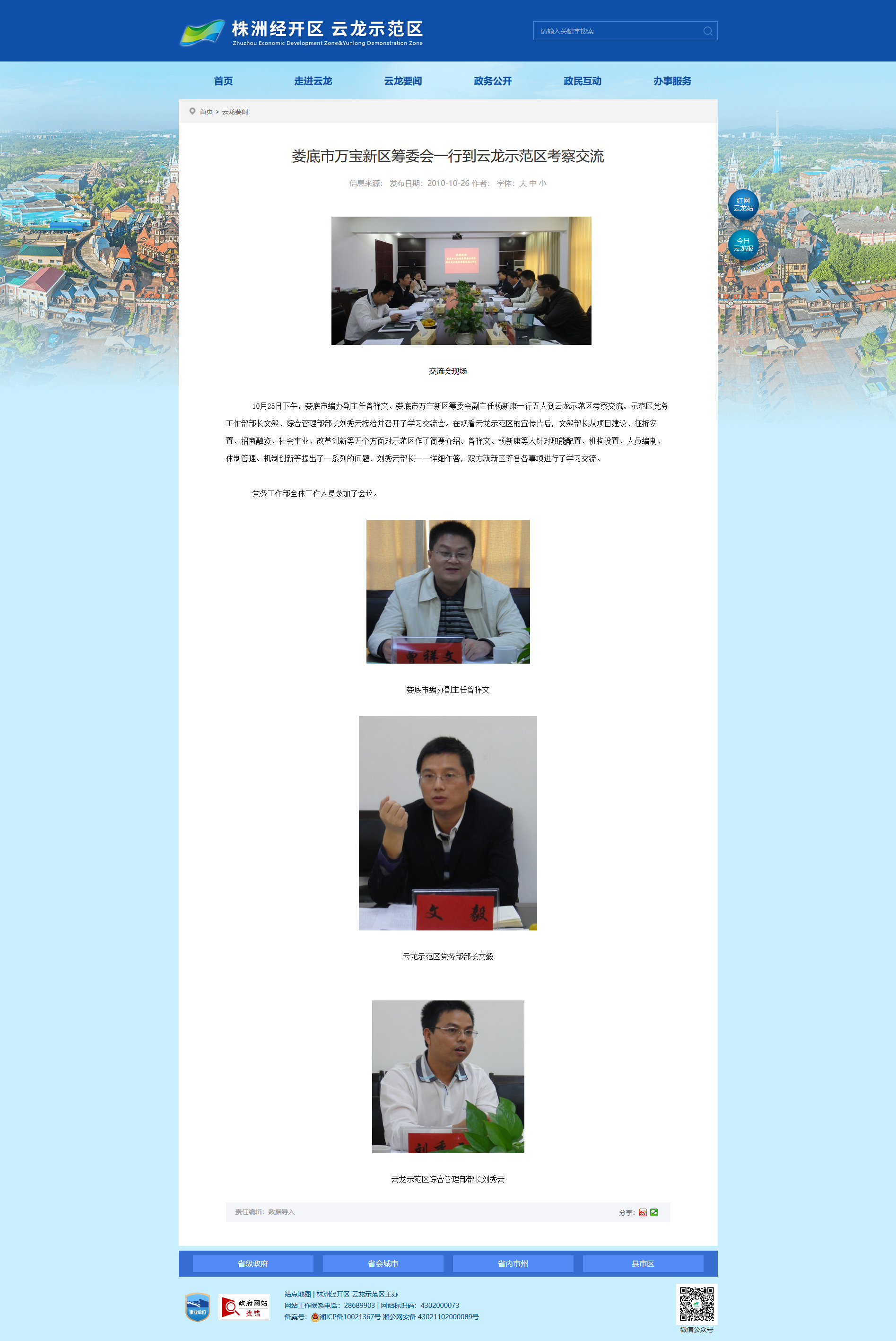 10月25日下午,娄底市编办副主任曾祥文、娄底市万宝新区筹委会副主任杨新康一行五人到云龙示范区考察交流。示范区党务工作部部长文毅、综合管理部部长刘秀云接洽并召开了学习交流会。在观看云龙示范区的宣传片后,文毅部长从项目建设、征拆安置、招商融资、社会事业、改革创新等五个方面对示范区作了简要介绍。曾祥文、杨新康等人针对职能配置、机构设置、人员编制、体制管理、机制创新等提出了一系列的问题,刘秀云部长一一详细作答,双方就新区筹备各事项进行了学习交流。