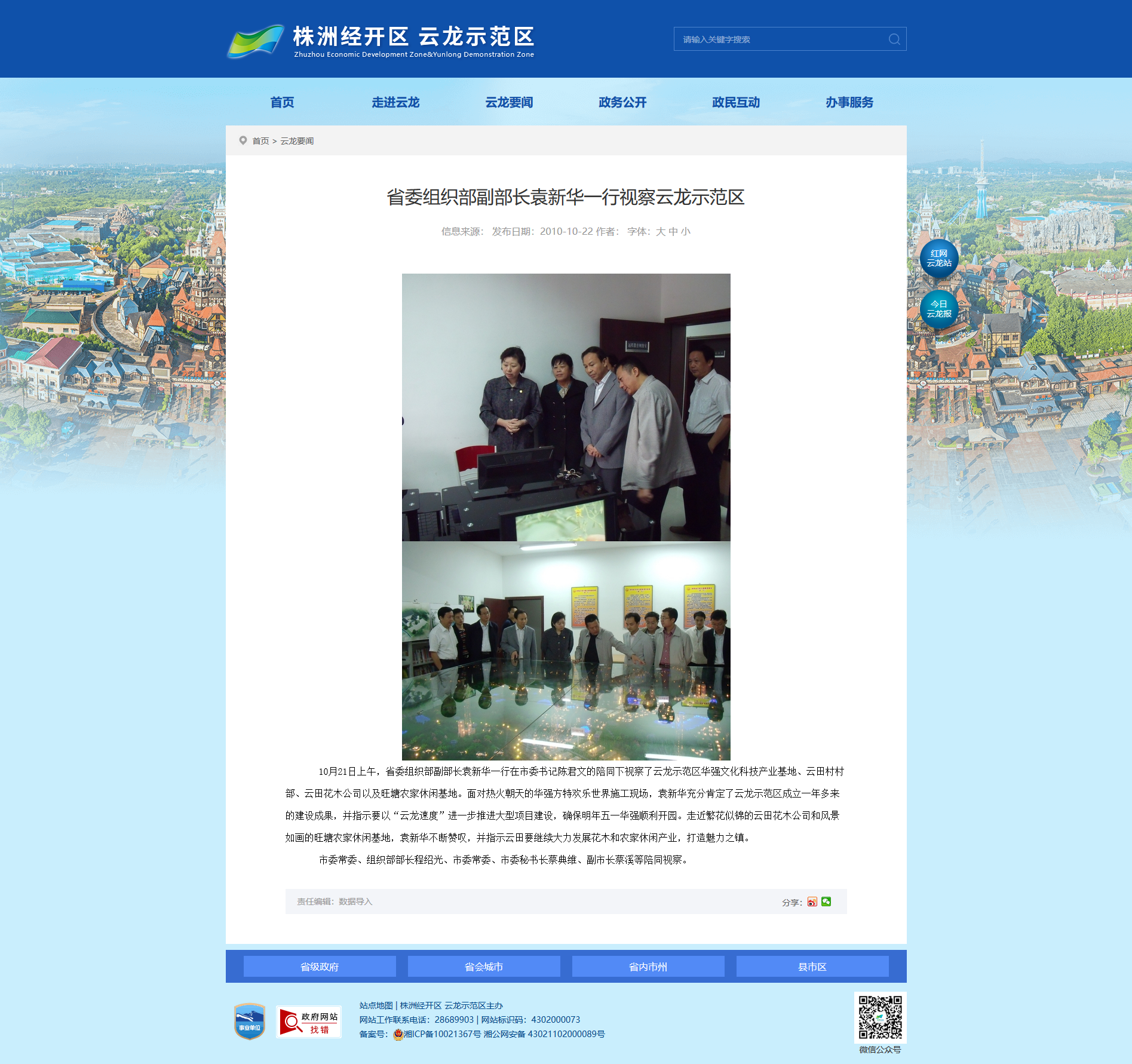 10月21日上午,省委组织部副部长袁新华一行在市委书记陈君文的陪同下视察了云龙示范区华强文化科技产业基地、云田村村部、云田花木公司以及旺塘农家休闲基地。面对热火朝天的华强方特欢乐世界施工现场,袁新华充分肯定了云龙示范区成立一年多来的建设成果,并指示要以“云龙速度”进一步推进大型项目建设,确保明年五一华强顺利开园。走近繁花似锦的云田花木公司和风景如画的旺塘农家休闲基地,袁新华不断赞叹,并指示云田要继续大力发展花木和农家休闲产业,打造魅力之镇。