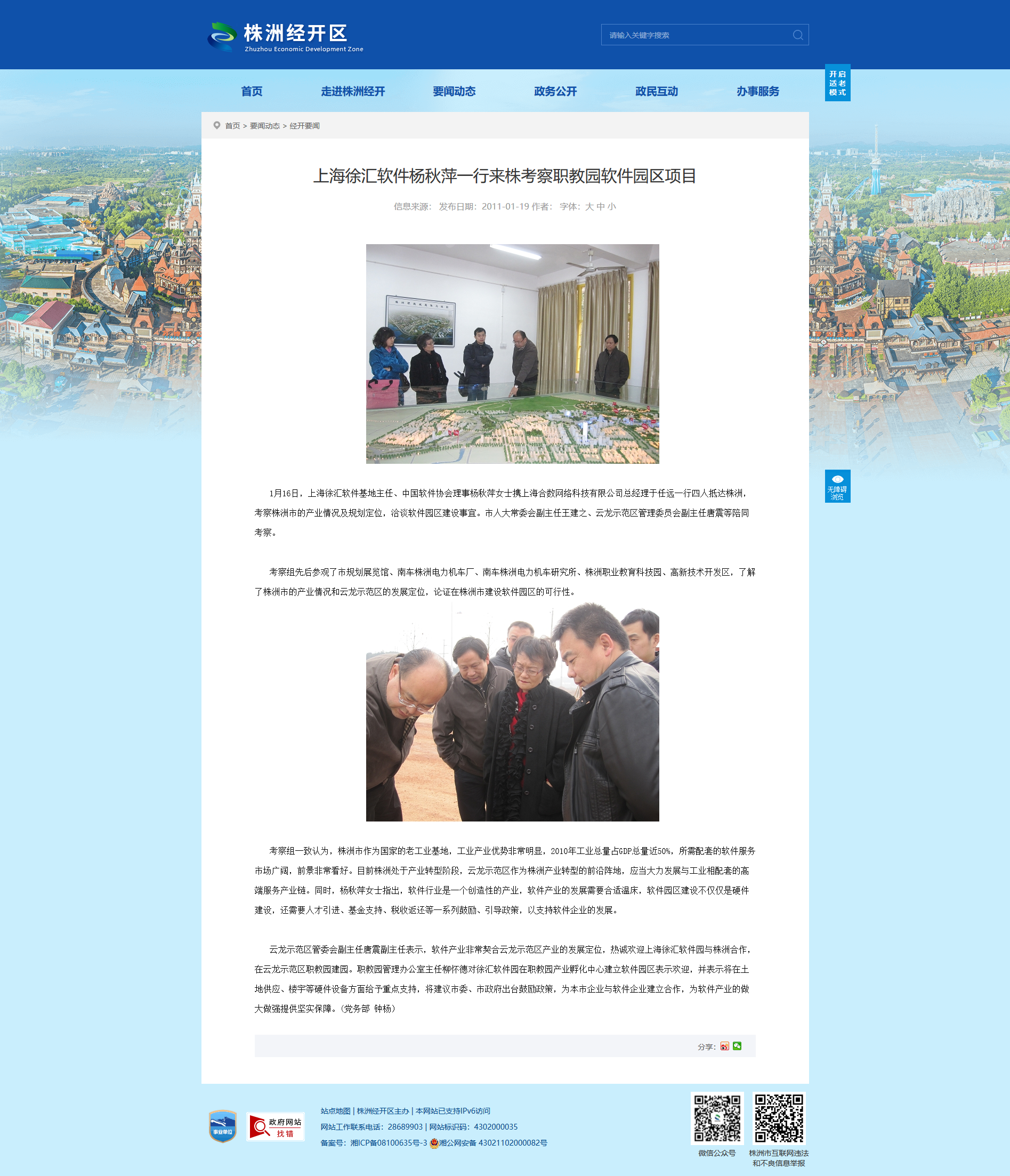 考察组先后参观了市规划展览馆、南车株洲电力机车厂、南车株洲电力机车研究所、株洲职业教育科技园、高新技术开发区,了解了株洲市的产业情况和云龙示范区的发展定位,论证在株洲市建设软件园区的可行性。