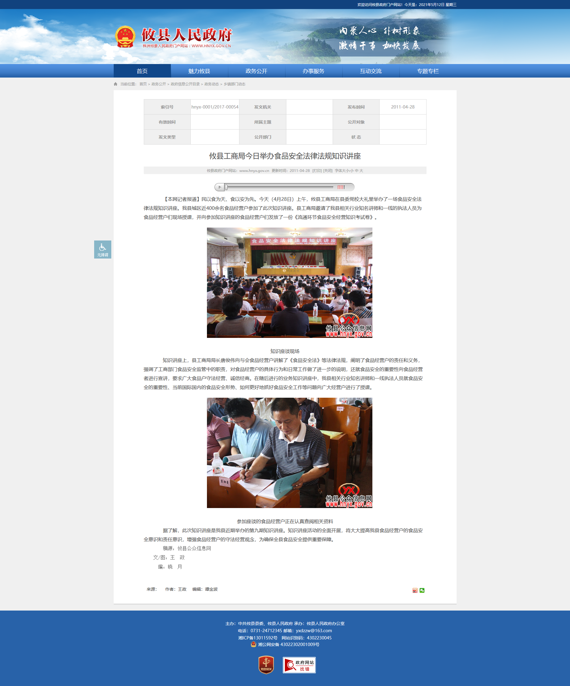 【本网记者报道】民以食为天、食以安为先。今天(4月28日)上午,攸县工商局在县委党校大礼堂举办了一场食品安全法律法规知识讲座。我县城区近400余名食品经营户参加了此次知识讲座。县工商局邀请了我县相关行业知名讲师和一线的执法人员为食品经营户们现场授课,并向参加知识讲座的食品经营户们发放了一份《流通环节食品安全经营知识考试卷》。