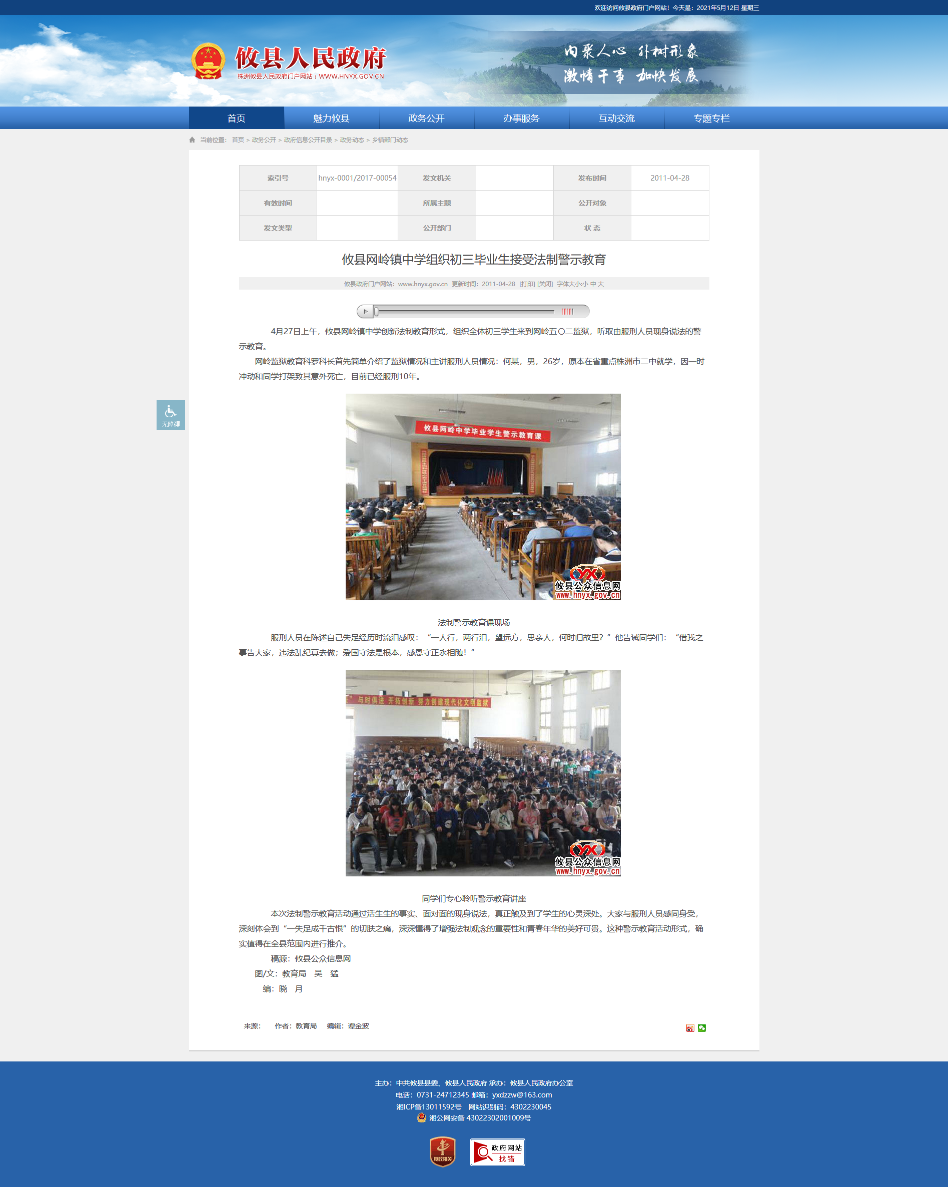 4月27日上午,攸县网岭镇中学创新法制教育形式,组织全体初三学生来到网岭五〇二监狱,听取由服刑人员现身说法的警示教育。