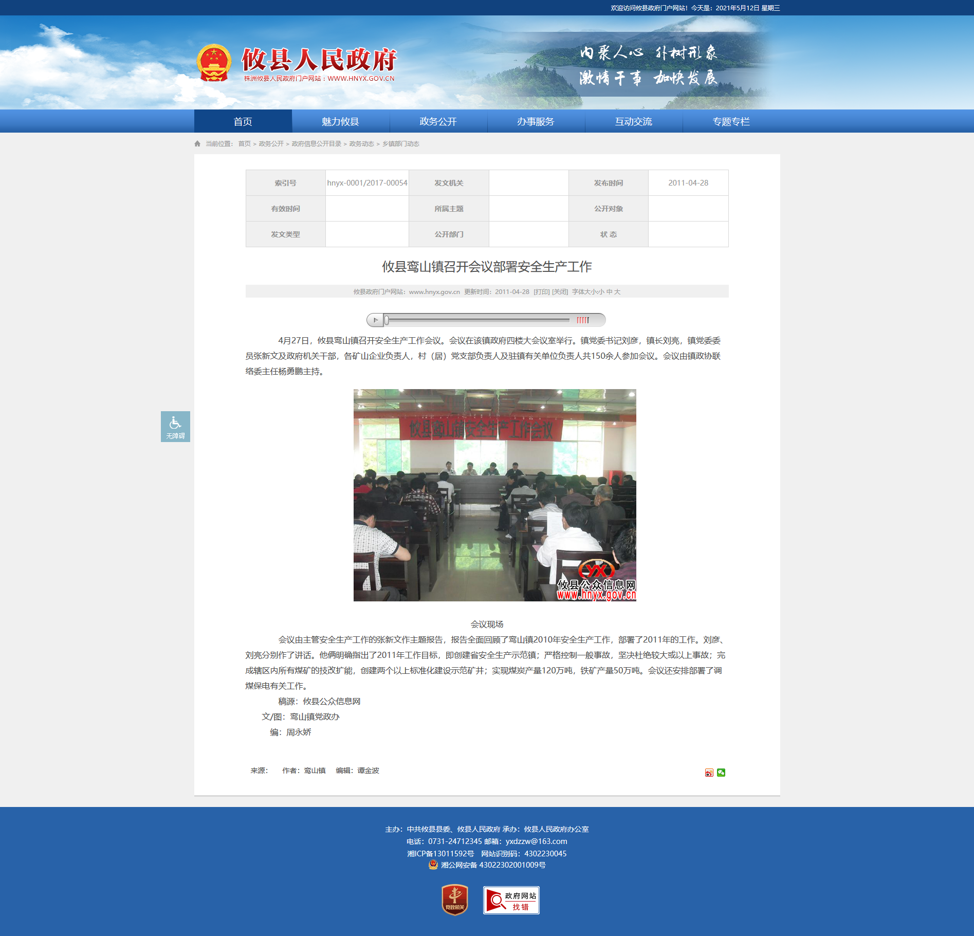 会议由主管安全生产工作的张新文作主题报告,报告全面回顾了鸾山镇2010年安全生产工作,部署了2011年的工作。刘彦、刘亮分别作了讲话。他俩明确指出了2011年工作目标,即创建省安全生产示范镇;严格控制一般事故,坚决杜绝较大或以上事故;完成辖区内所有煤矿的技改扩能,创建两个以上标准化建设示范矿井;实现煤炭产量120万吨,铁矿产量50万吨。会议还安排部署了调煤保电有关工作。