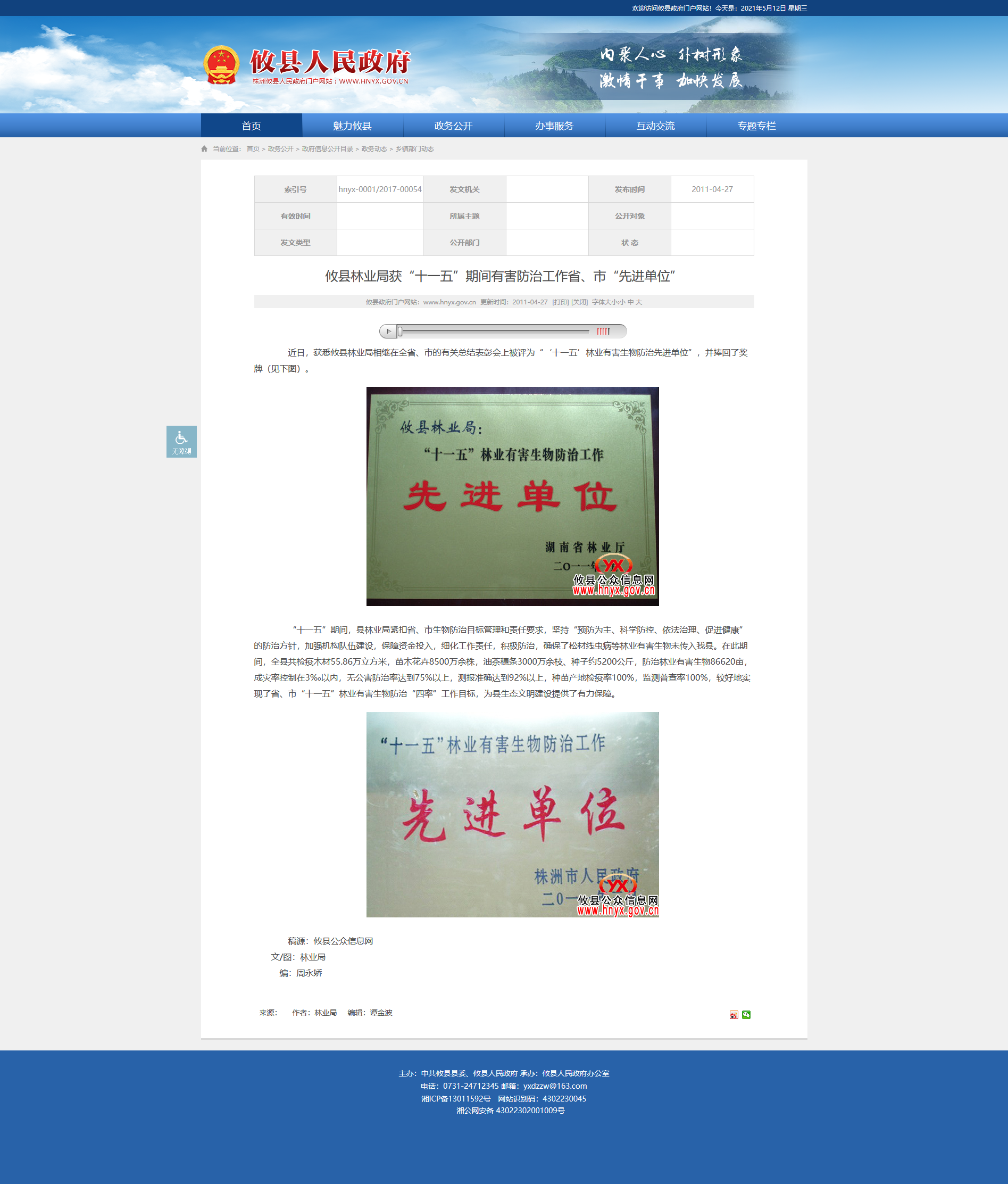 近日,获悉攸县林业局相继在全省、市的有关总结表彰会上被评为“‘十一五’林业有害生物防治先进单位”,并捧回了奖牌(见下图)。