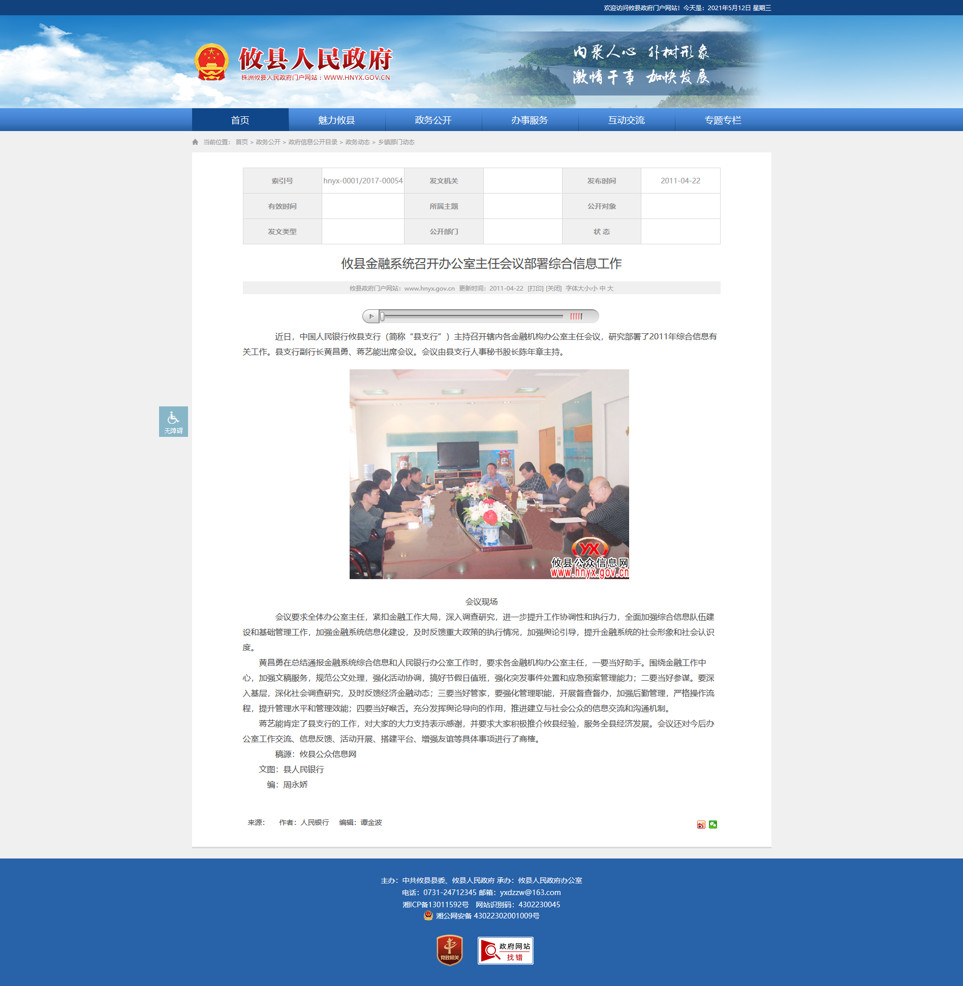 近日,中国人民银行攸县支行(简称“县支行”)主持召开辖内各金融机构办公室主任会议,研究部署了2011年综合信息有关工作。县支行副行长黄昌勇、蒋艺能出席会议。会议由县支行人事秘书股长陈年章主持。