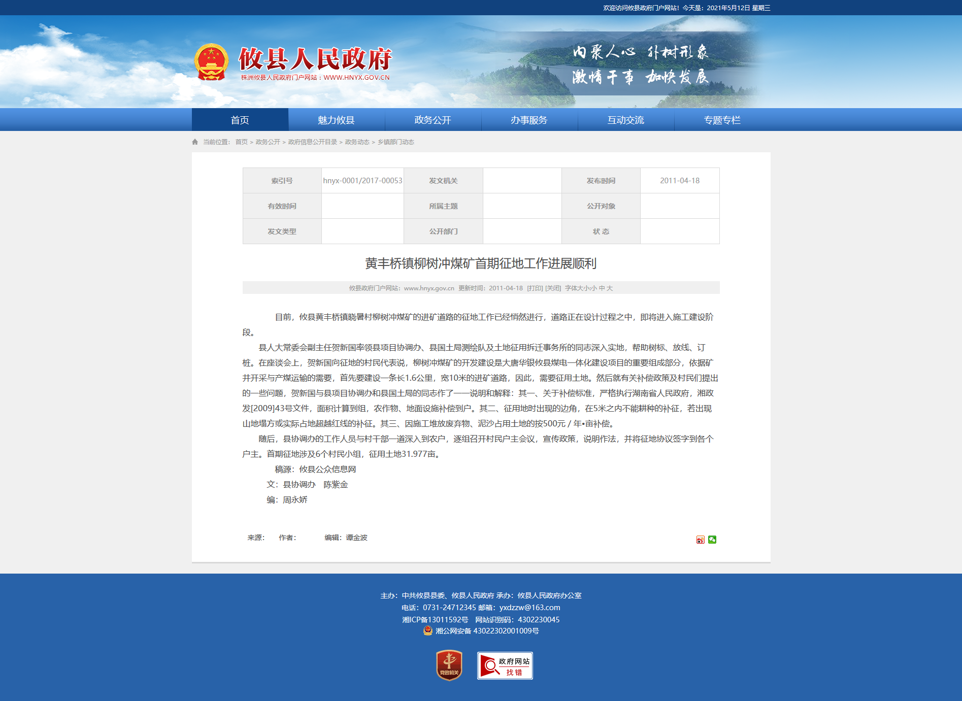 县人大常委会副主任贺新国率领县项目协调办、县国土局测绘队及土地征用拆迁事务所的同志深入实地,帮助树标、放线、订桩。在座谈会上,贺新国向征地的村民代表说,柳树冲煤矿的开发建设是大唐华银攸县煤电一体化建设项目的重要组成部分,依据矿井开采与产煤运输的需要,首先要建设一条长1.6公里,宽10米的进矿道路,因此,需要征用土地。然后就有关补偿政策及村民们提出的一些问题,贺新国与县项目协调办和县国土局的同志作了一一说明和解释:其一、关于补偿标准,严格执行湖南省人民政府,湘政发[2009]43号文件,面积计算到组,农作物、地面设施补偿到户。其二、征用地时出现的边角,在5米之内不能耕种的补征,若出现山地塌方或实际占地超越红线的补征。其三、因施工堆放废弃物、泥沙占用土地的按500元/年•亩补偿。