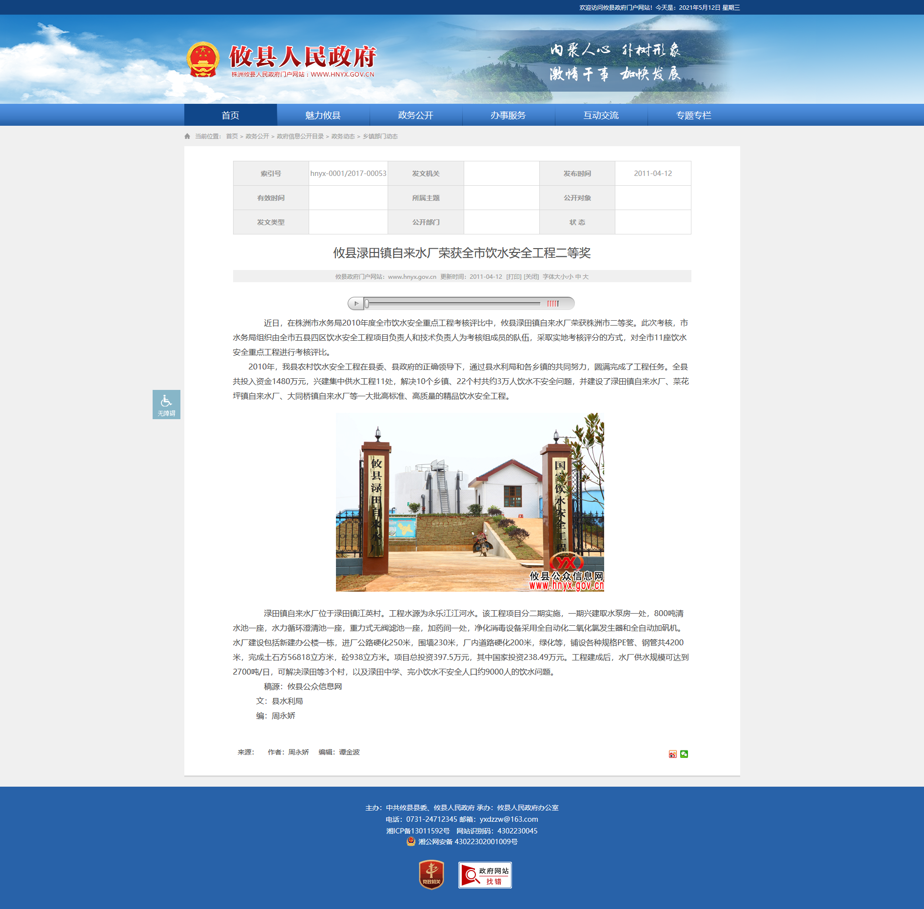 2010年,我县农村饮水安全工程在县委、县政府的正确领导下,通过县水利局和各乡镇的共同努力,圆满完成了工程任务。全县共投入资金1480万元,兴建集中供水工程11处,解决10个乡镇、22个村共约3万人饮水不安全问题,并建设了渌田镇自来水厂、菜花坪镇自来水厂、大同桥镇自来水厂等一大批高标准、高质量的精品饮水安全工程。