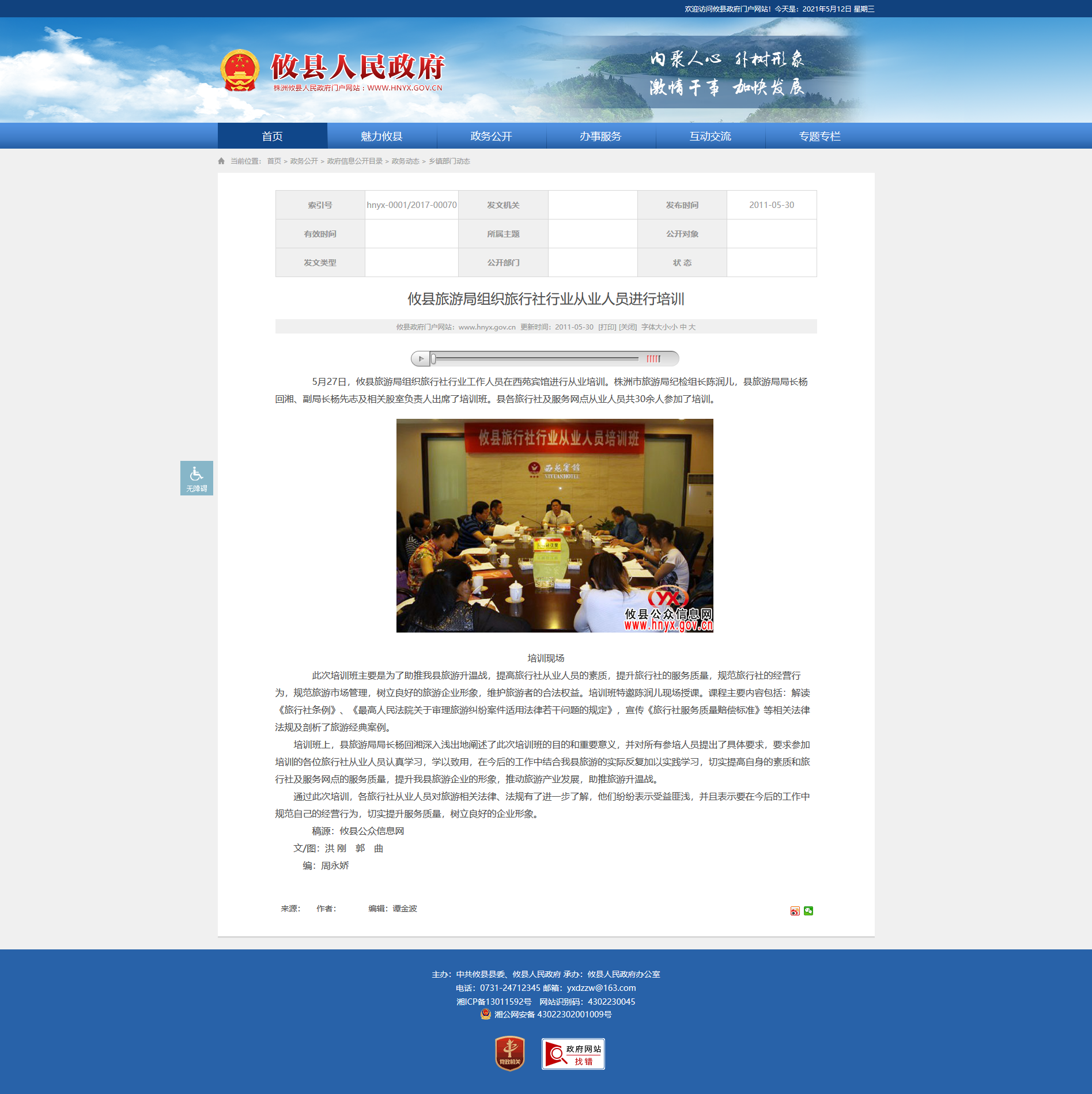 5月27日,攸县旅游局组织旅行社行业工作人员在西苑宾馆进行从业培训。株洲市旅游局纪检组长陈润儿,县旅游局局长杨回湘、副局长杨先志及相关股室负责人出席了培训班。县各旅行社及服务网点从业人员共30余人参加了培训。