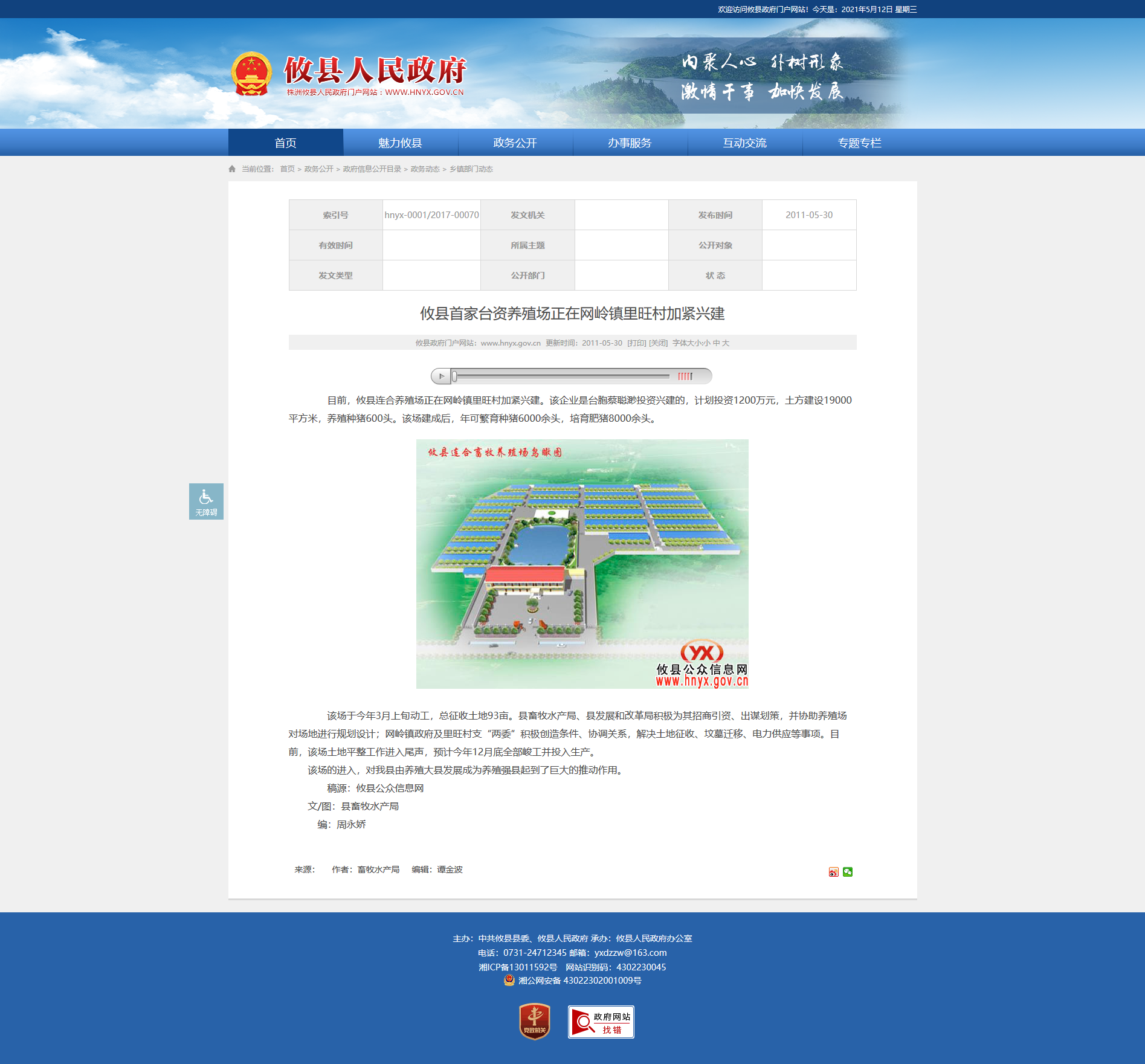 该场于今年3月上旬动工,总征收土地93亩。县畜牧水产局、县发展和改革局积极为其招商引资、出谋划策,并协助养殖场对场地进行规划设计;网岭镇政府及里旺村支“两委”积极创造条件、协调关系,解决土地征收、坟墓迁移、电力供应等事项。目前,该场土地平整工作进入尾声,预计今年12月底全部峻工并投入生产。