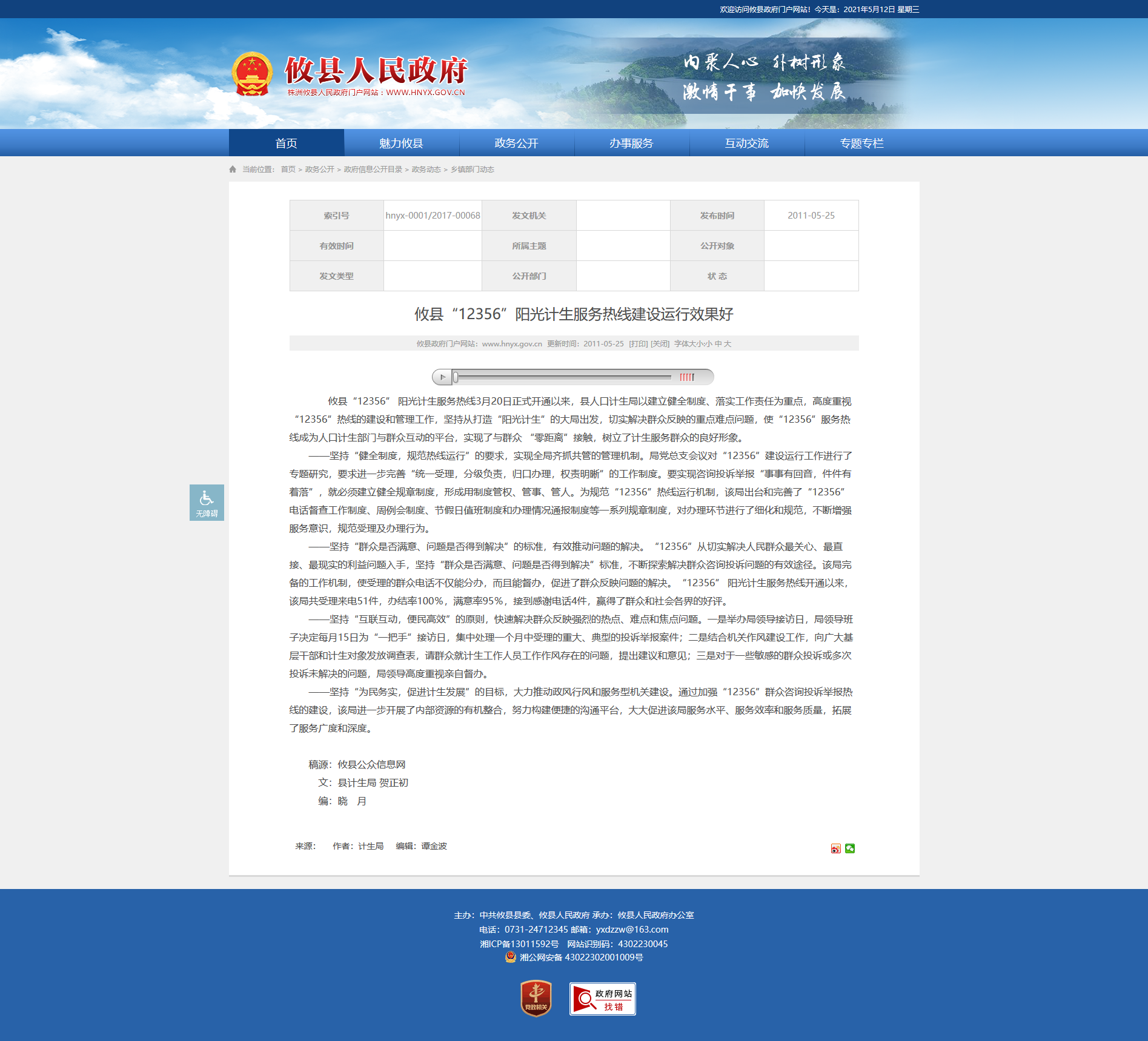 攸县“12356” 阳光计生服务热线3月20日正式开通以来,县人口计生局以建立健全制度、落实工作责任为重点,高度重视“12356”热线的建设和管理工作,坚持从打造“阳光计生”的大局出发,切实解决群众反映的重点难点问题,使“12356”服务热线成为人口计生部门与群众互动的平台,实现了与群众 “零距离”接触,树立了计生服务群众的良好形象。