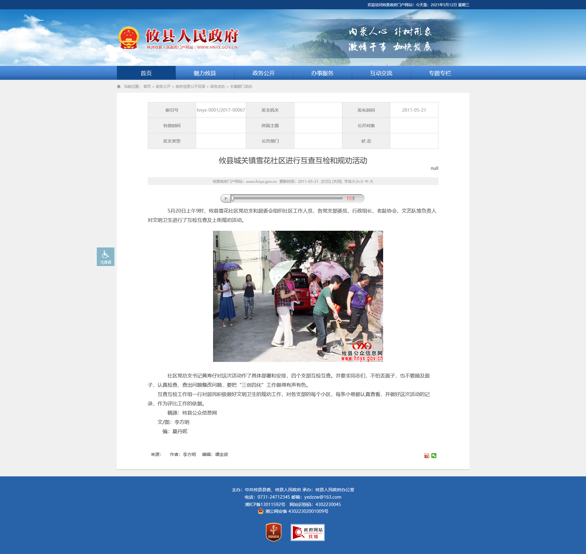 5月20日上午9时,攸县雪花社区党总支和居委会组织社区工作人员,各党支部委员、行政组长、老龄协会、文艺队等负责人对文明卫生进行了互检互查及上街规劝活动。