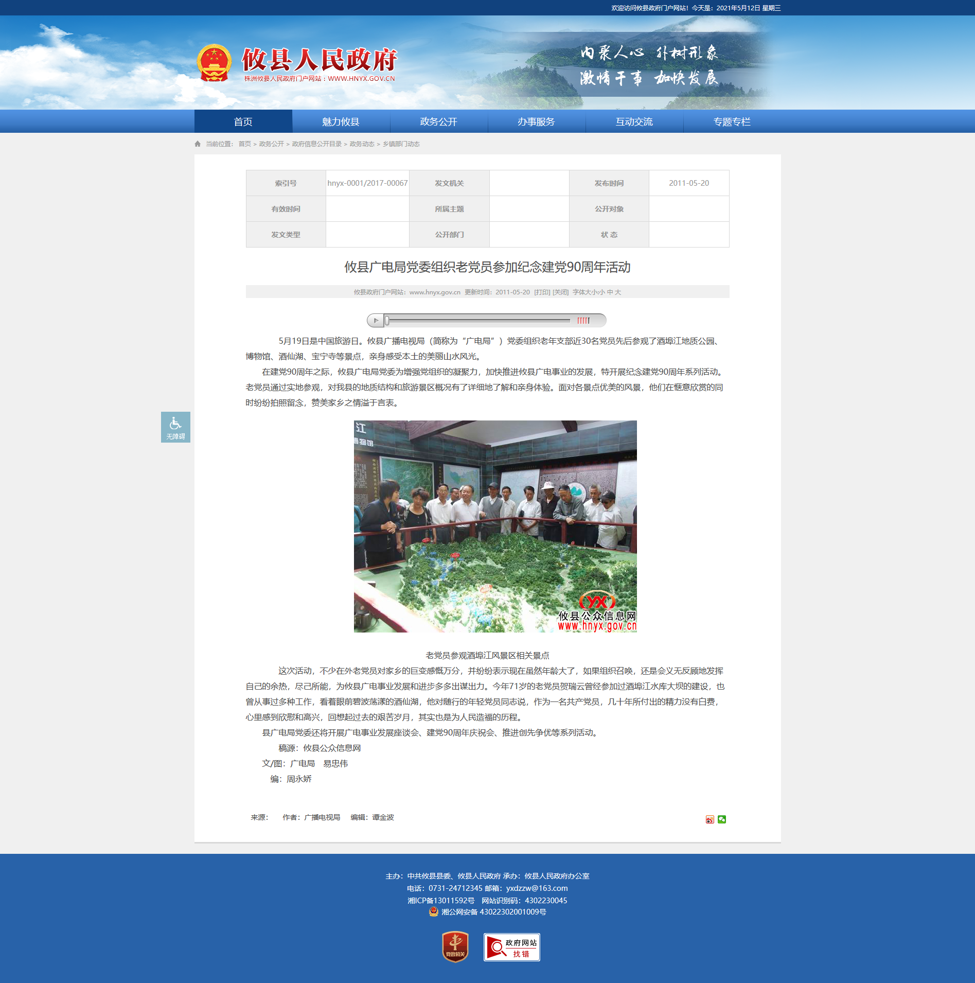 5月19日是中国旅游日。攸县广播电视局(简称为“广电局”)党委组织老年支部近30名党员先后参观了酒埠江地质公园、博物馆、酒仙湖、宝宁寺等景点,亲身感受本土的美丽山水风光。