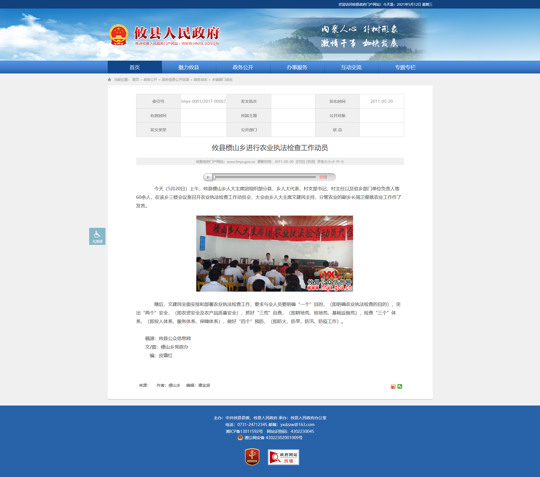 今天(5月20日)上午,攸县槚山乡人大主席团组织部分县、乡人大代表、村支部书记、村主任以及驻乡部门单位负责人等60余人,在该乡三楼会议室召开农业执法检查工作动员会,大会由乡人大主席文建民主持,分管农业的副乡长周卫星就农业工作作了发言。