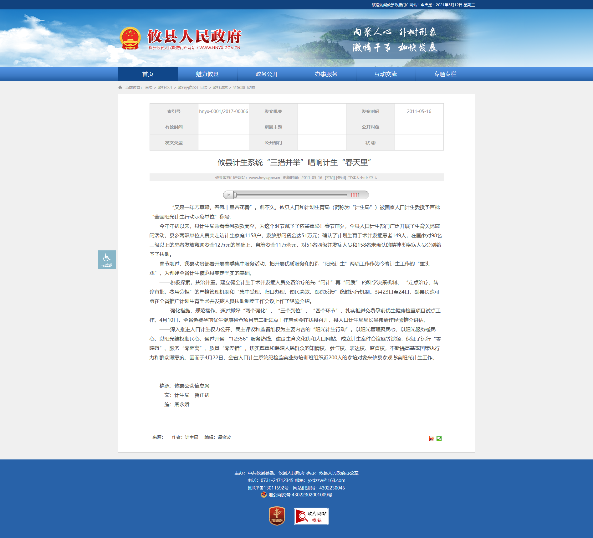 ——深入推进人口计生权力公开、民主评议和监督维权为主要内容的“阳光计生行动”。以阳光管理聚民心、以阳光服务暖民心、以阳光维权顺民心,通过开通 “12356”服务热线、建设生育文化街和人口网站、成立计生案件合议庭等途径,保证了运行“零障碍”、服务“零距离”、质量“零差错”,切实尊重和保障人民群众的知情权、参与权、表达权、监督权,不断提高基本国策执行力和群众满意度。因而于4月22日,全省人口计生系统纪检监察业务培训班组织近200人的参培对象来攸县参观考察阳光计生工作。