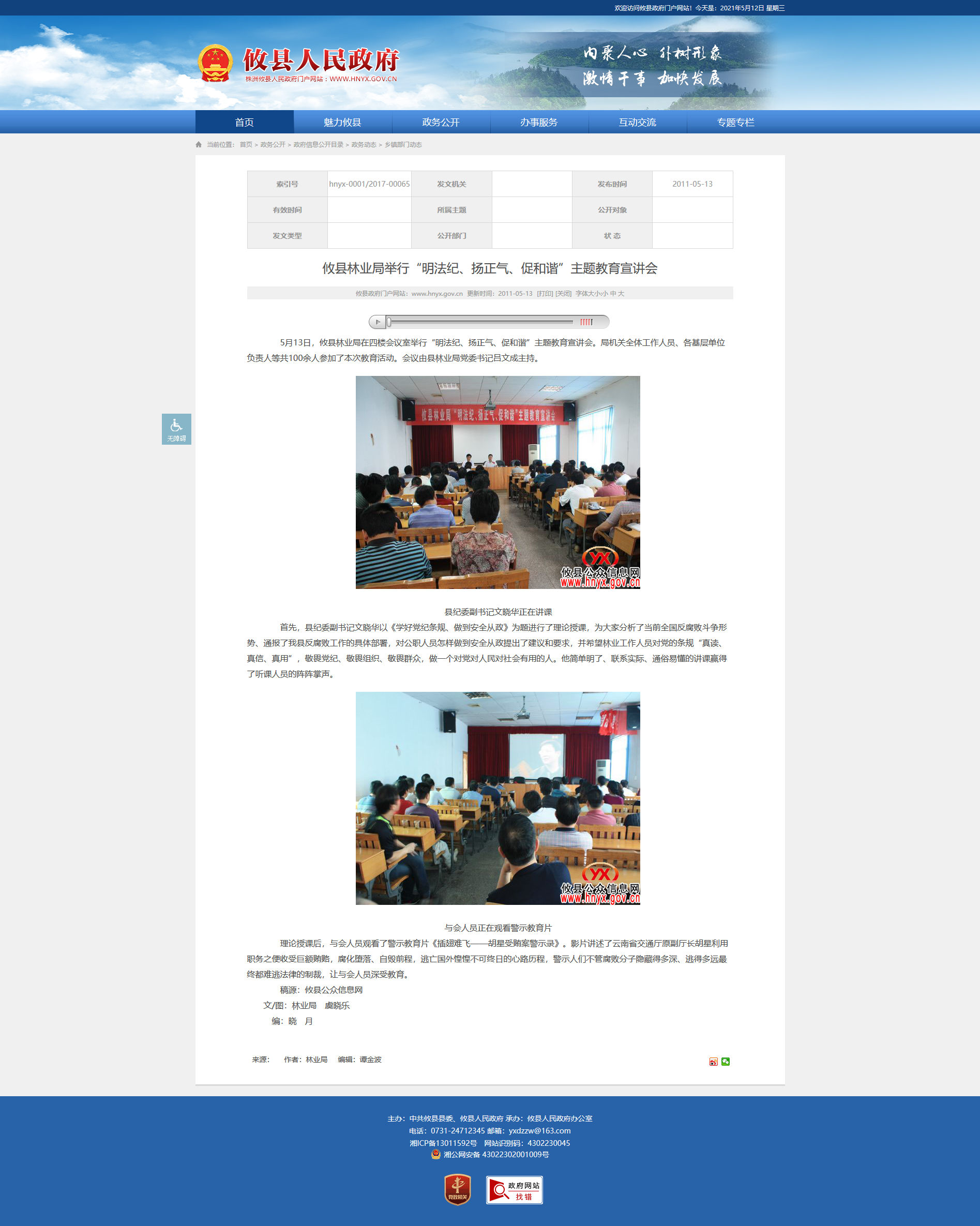 5月13日,攸县林业局在四楼会议室举行“明法纪、扬正气、促和谐”主题教育宣讲会。局机关全体工作人员、各基层单位负责人等共100余人参加了本次教育活动。会议由县林业局党委书记吕文成主持。
