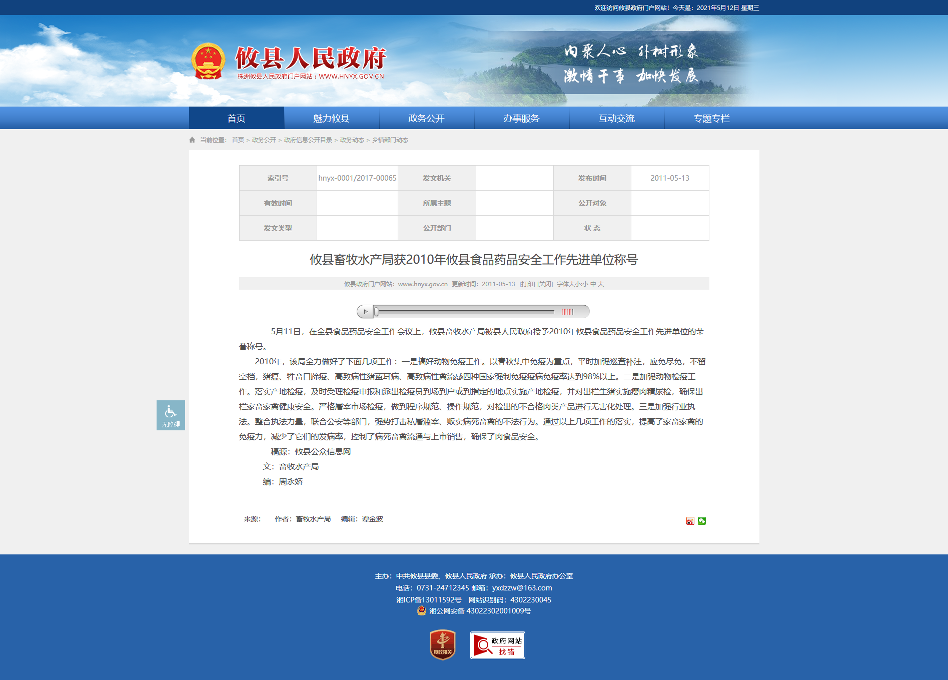 5月11日,在全县食品药品安全工作会议上,攸县畜牧水产局被县人民政府授予2010年攸县食品药品安全工作先进单位的荣誉称号。