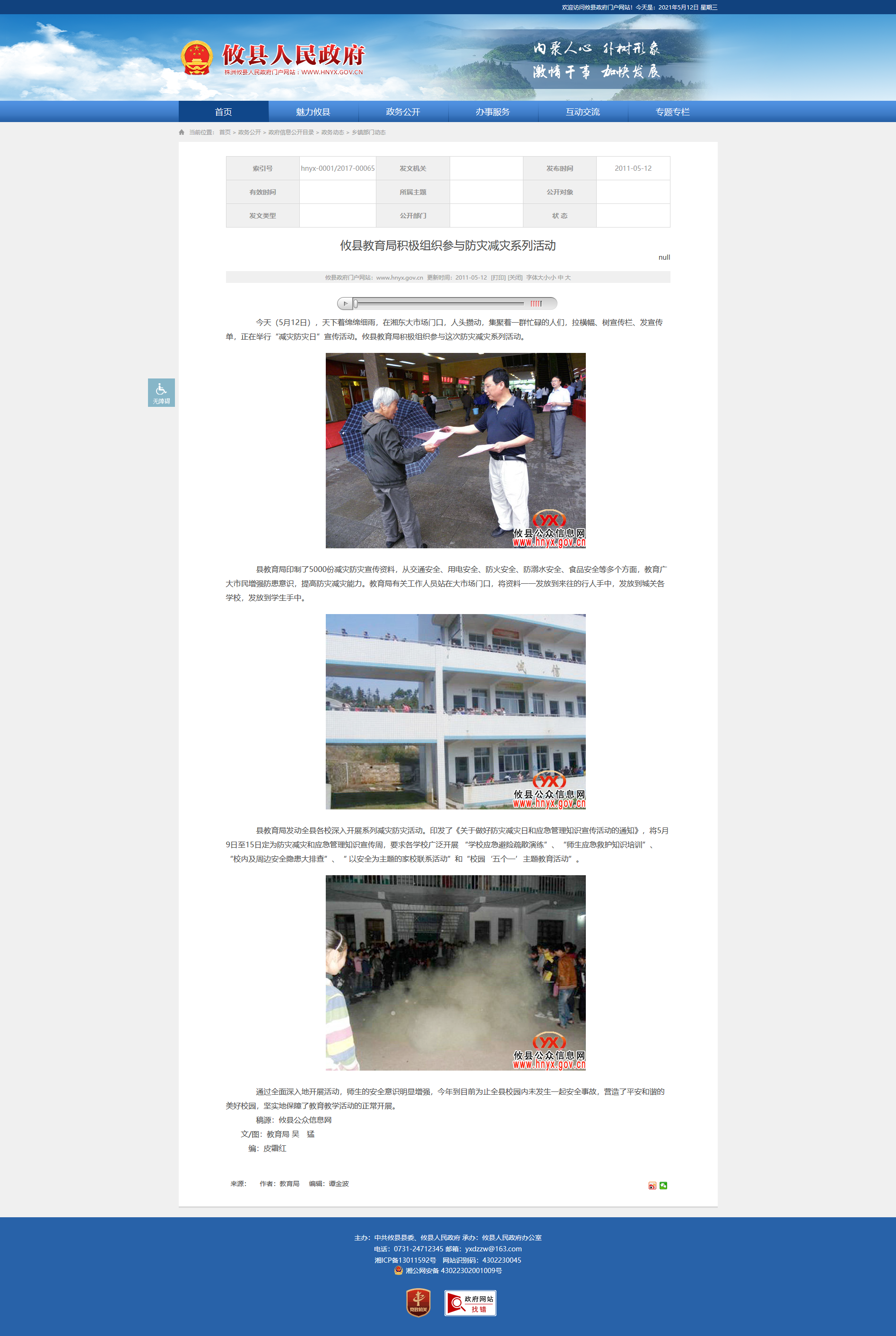 今天(5月12日),天下着绵绵细雨,在湘东大市场门口,人头攒动,集聚着一群忙碌的人们,拉横幅、树宣传栏、发宣传单,正在举行“减灾防灾日”宣传活动。攸县教育局积极组织参与这次防灾减灾系列活动。