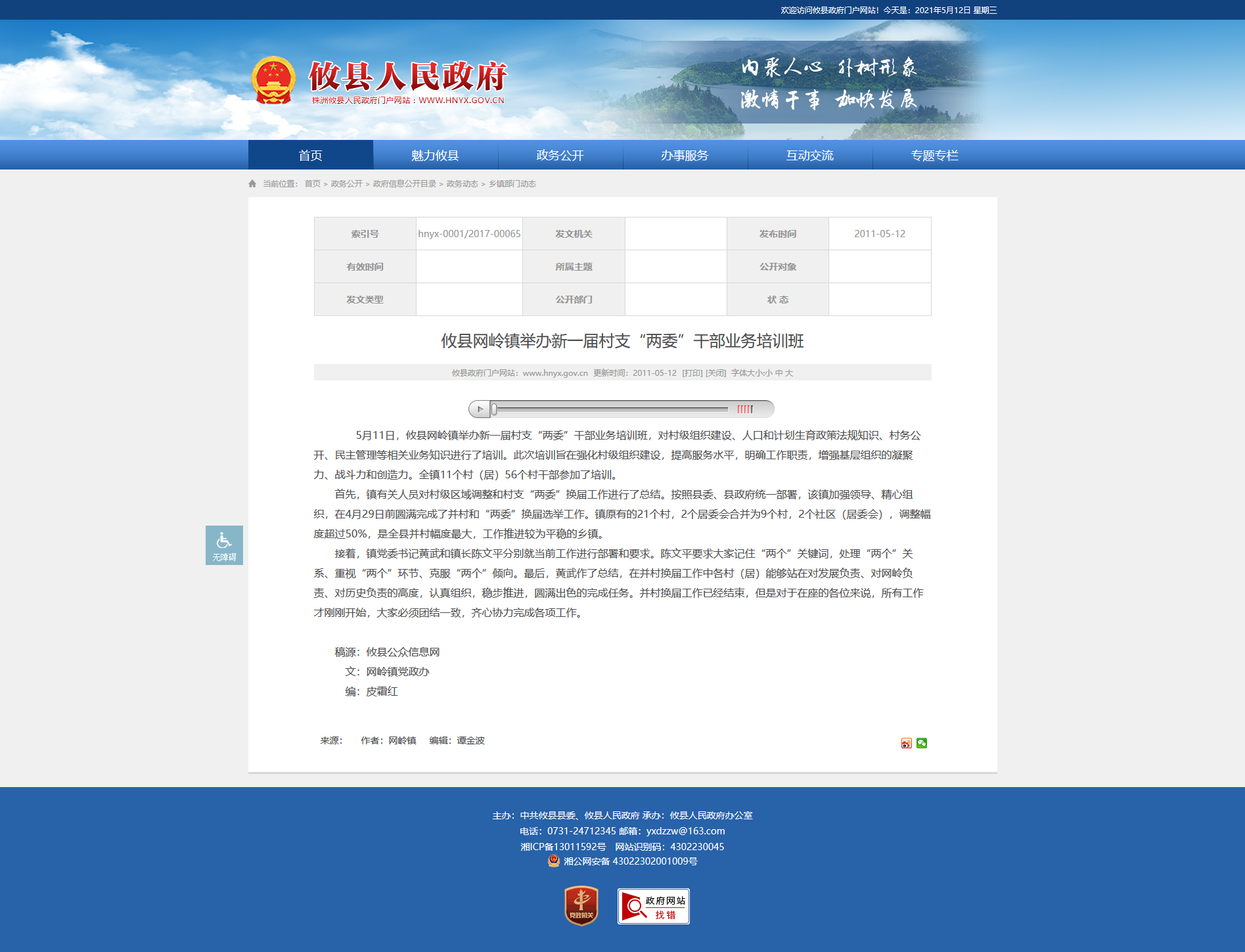 5月11日,攸县网岭镇举办新一届村支“两委”干部业务培训班,对村级组织建设、人口和计划生育政策法规知识、村务公开、民主管理等相关业务知识进行了培训。此次培训旨在强化村级组织建设,提高服务水平,明确工作职责,增强基层组织的凝聚力、战斗力和创造力。全镇11个村(居)56个村干部参加了培训。