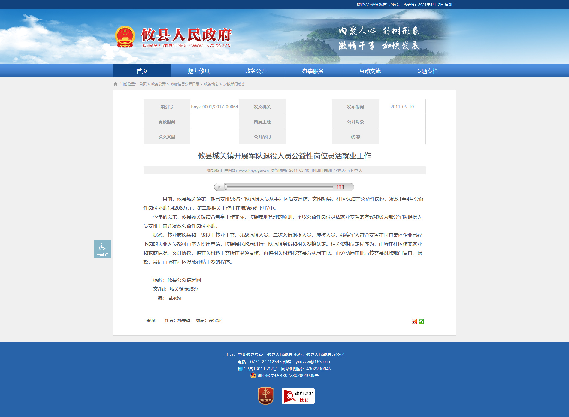 今年初以来,攸县城关镇结合自身工作实际,按照属地管理的原则,采取公益性岗位灵活就业安置的方式积极为部分军队退役人员安排上岗并发放公益性岗位补贴。