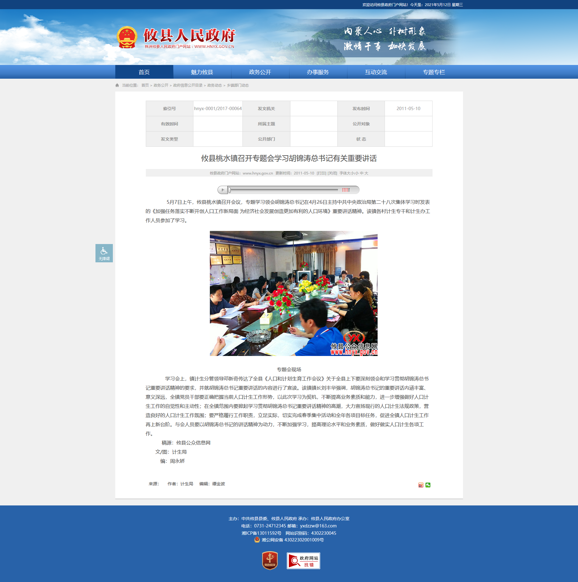 5月7日上午,攸县桃水镇召开会议,专题学习领会胡锦涛总书记在4月26日主持中共中央政治局第二十八次集体学习时发表的《加强任务落实不断开创人口工作新局面 为经济社会发展创造更加有利的人口环境》重要讲话精神。该镇各村计生专干和计生办工作人员参加了学习。