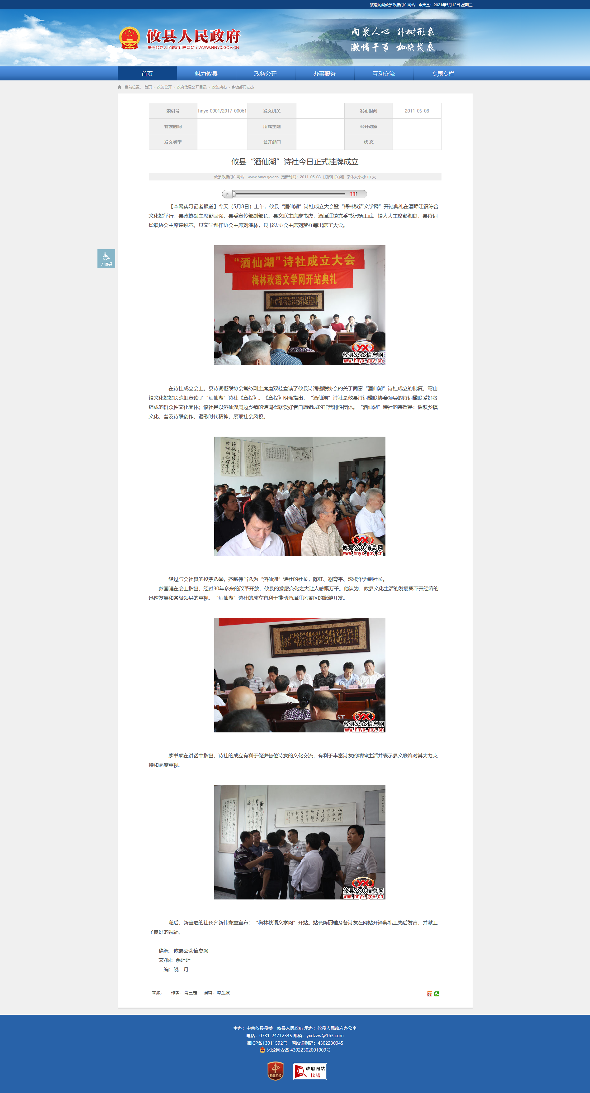 【本网实习记者报道】今天(5月8日)上午,攸县“酒仙湖”诗社成立大会暨“梅林秋语文学网”开站典礼在酒埠江镇综合文化站举行。县政协副主席彭国强,县委宣传部副部长、县文联主席廖书虎,酒埠江镇党委书记杨正武、镇人大主席彭湘良,县诗词楹联协会主席谭锐志,县文学创作协会主席刘湘林,县书法协会主席刘梦祥等出席了大会。