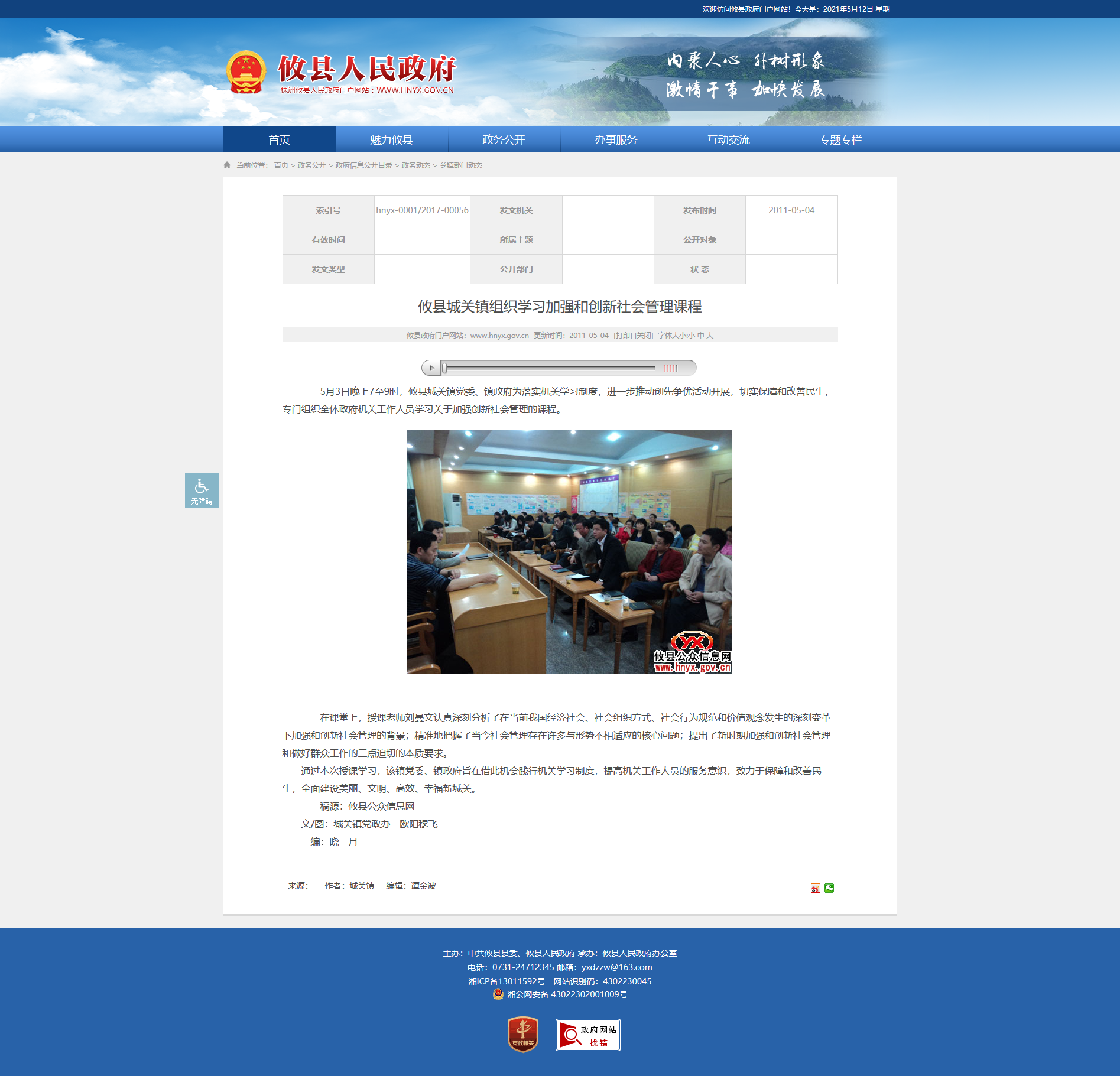 5月3日晚上7至9时,攸县城关镇党委、镇政府为落实机关学习制度,进一步推动创先争优活动开展,切实保障和改善民生,专门组织全体政府机关工作人员学习关于加强创新社会管理的课程。