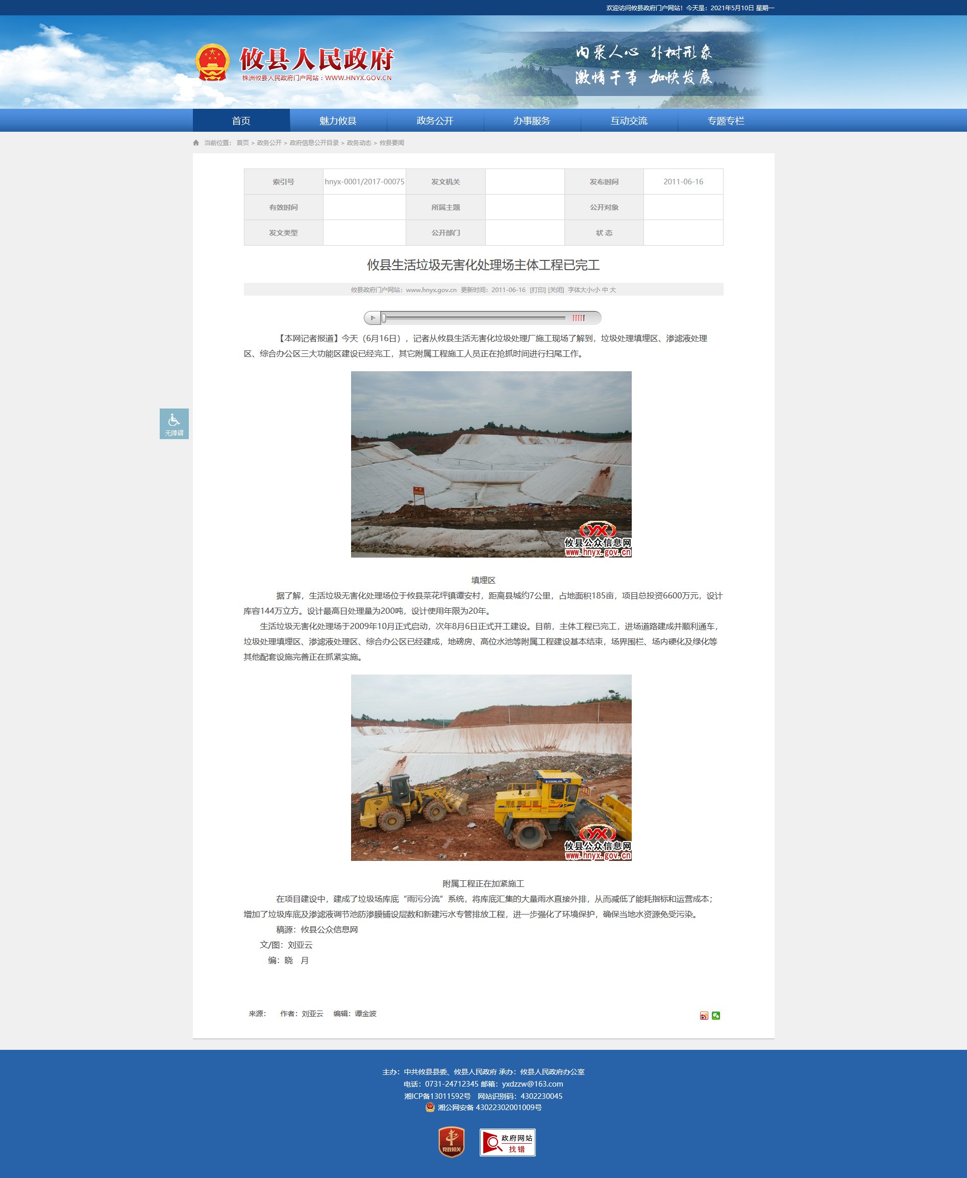 生活垃圾无害化处理场于2009年10月正式启动,次年8月6日正式开工建设。目前,主体工程已完工,进场道路建成并顺利通车,垃圾处理填埋区、渗滤液处理区、综合办公区已经建成,地磅房、高位水池等附属工程建设基本结束,场界围栏、场内硬化及绿化等其他配套设施完善正在抓紧实施。