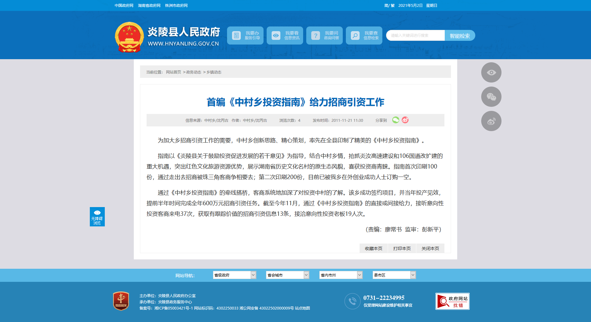 指南以《炎陵县关于鼓励投资促进发展的若干意见》为指导,结合中村乡情,抢抓炎汝高速建设和106国道改扩建的重大机遇,突出红色文化旅游资源优势,展示湖南省历史文化名村的原生态风貌,喜获投资商青睐。指南首次印刷100份,通过走出去招商被珠三角客商争相要去;第二次印刷200份,目前已被我乡在外创业成功人士订购一空。