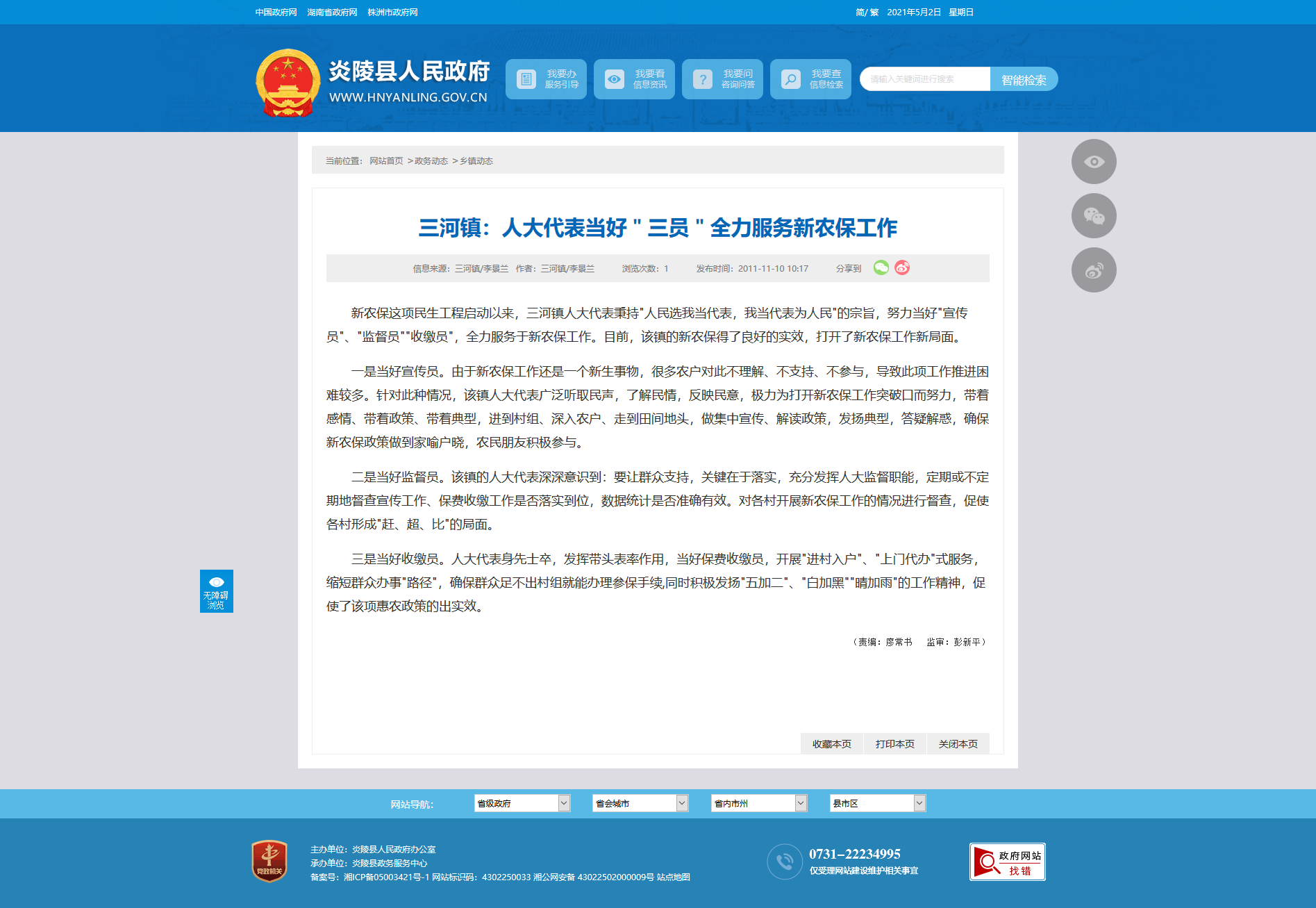 新农保这项民生工程启动以来,三河镇人大代表秉持"人民选我当代表,我当代表为人民"的宗旨,努力当好"宣传员"、"监督员""收缴员",全力服务于新农保工作。目前,该镇的新农保得了良好的实效,打开了新农保工作新局面。