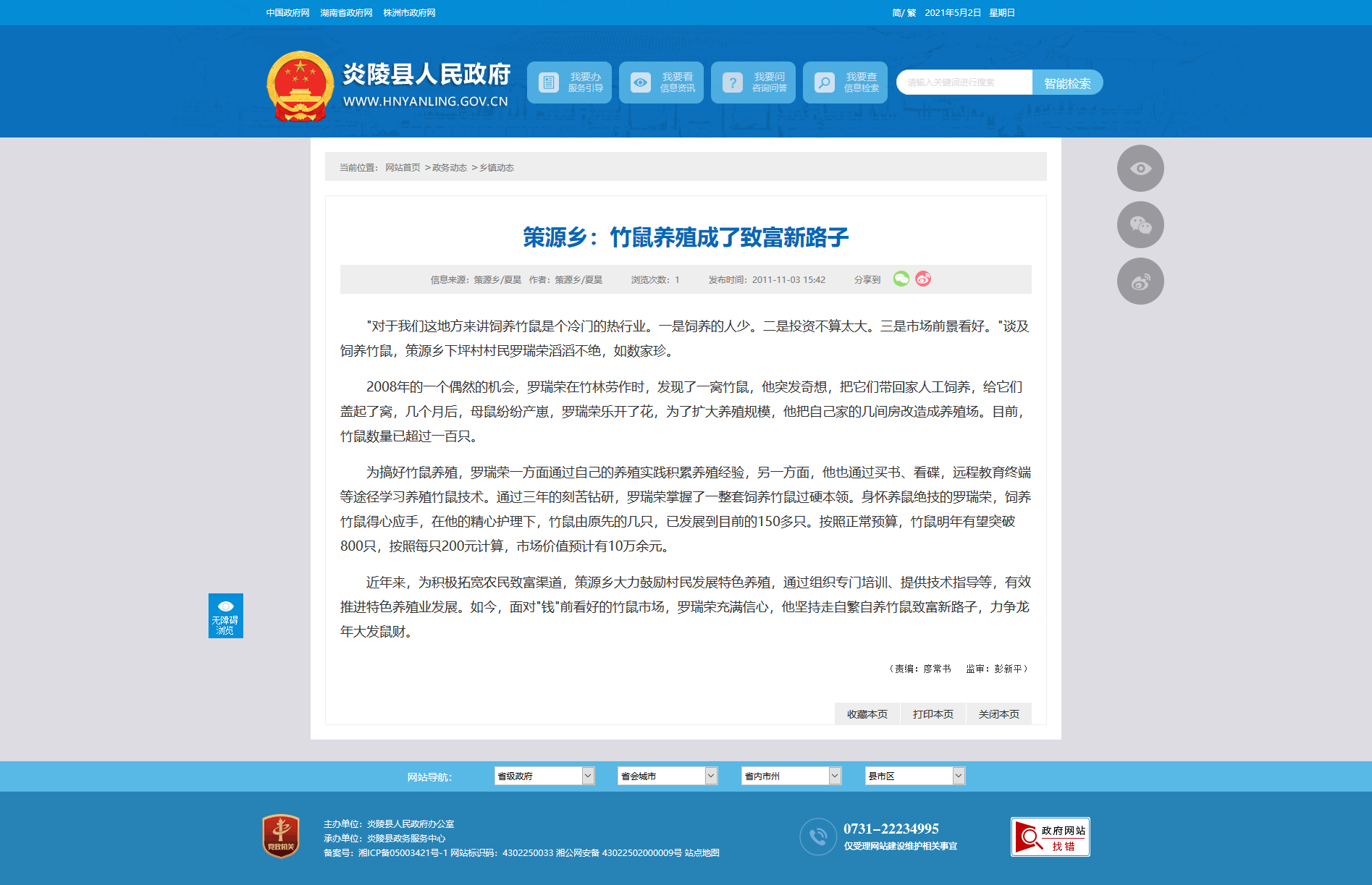 近年来,为积极拓宽农民致富渠道,策源乡大力鼓励村民发展特色养殖,通过组织专门培训、提供技术指导等,有效推进特色养殖业发展。如今,面对"钱"前看好的竹鼠市场,罗瑞荣充满信心,他坚持走自繁自养竹鼠致富新路子,力争龙年大发鼠财。