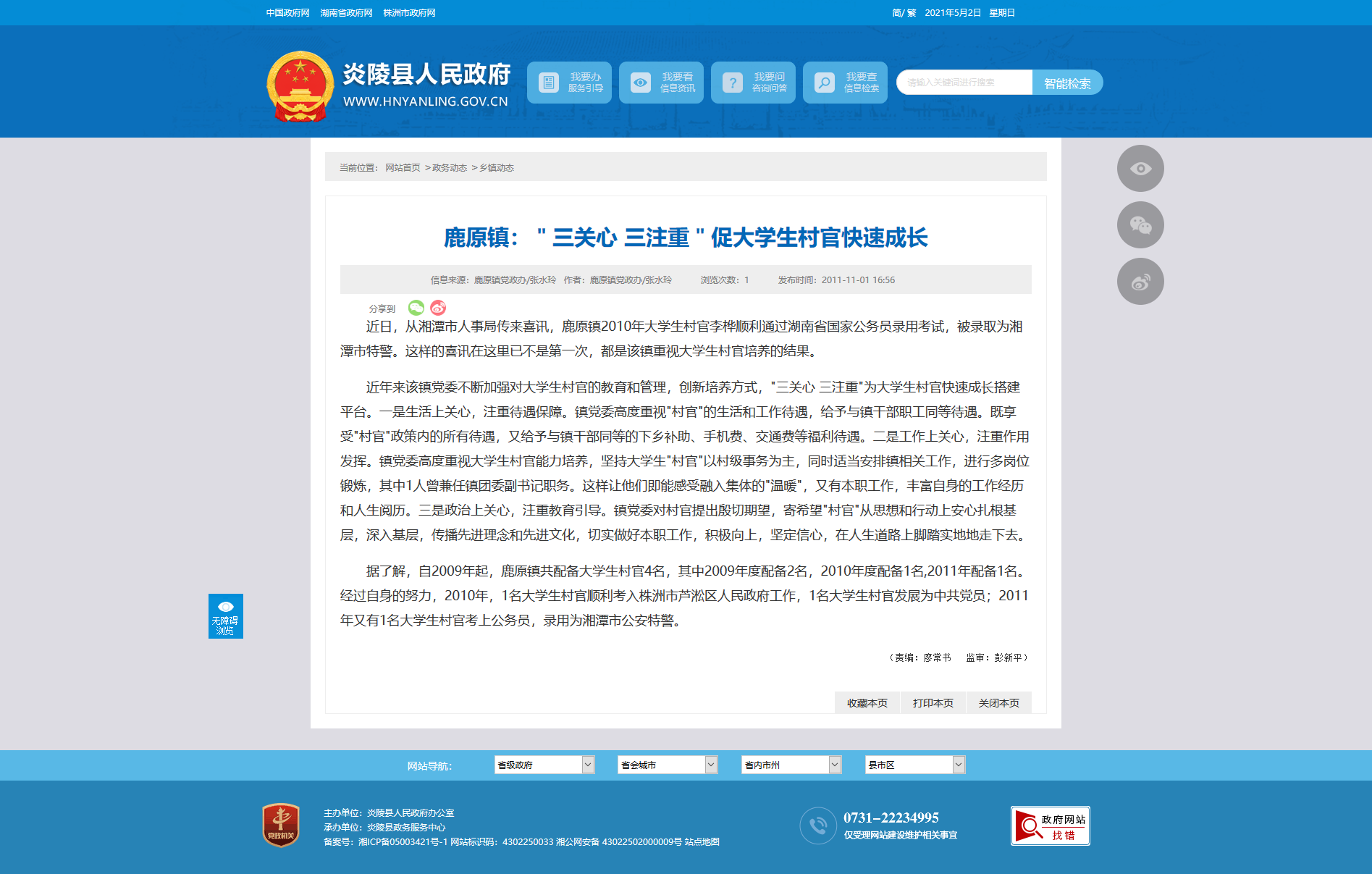 据了解,自2009年起,鹿原镇共配备大学生村官4名,其中2009年度配备2名,2010年度配备1名,2011年配备1名。经过自身的努力,2010年,1名大学生村官顺利考入株洲市芦淞区人民政府工作,1名大学生村官发展为中共党员;2011年又有1名大学生村官考上公务员,录用为湘潭市公安特警。