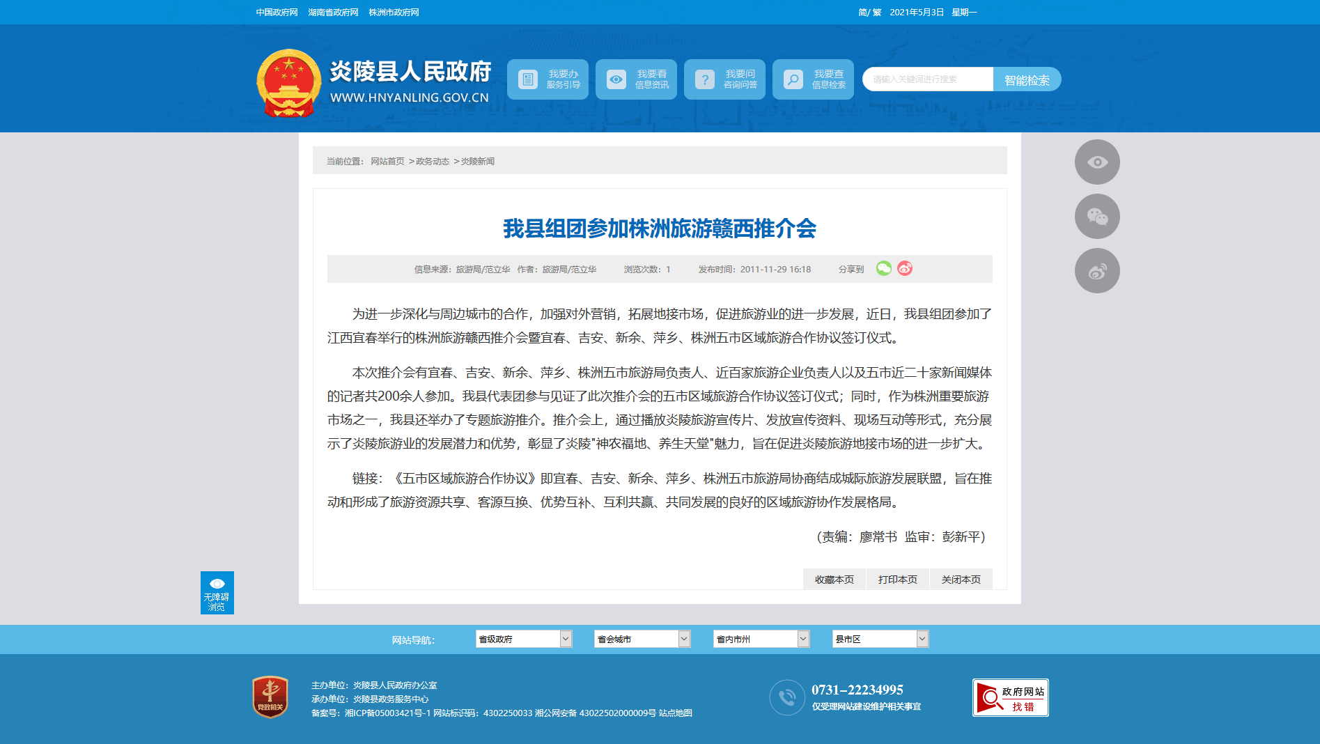 本次推介会有宜春、吉安、新余、萍乡、株洲五市旅游局负责人、近百家旅游企业负责人以及五市近二十家新闻媒体的记者共200余人参加。我县代表团参与见证了此次推介会的五市区域旅游合作协议签订仪式;同时,作为株洲重要旅游市场之一,我县还举办了专题旅游推介。推介会上,通过播放炎陵旅游宣传片、发放宣传资料、现场互动等形式,充分展示了炎陵旅游业的发展潜力和优势,彰显了炎陵"神农福地、养生天堂"魅力,旨在促进炎陵旅游地接市场的进一步扩大。