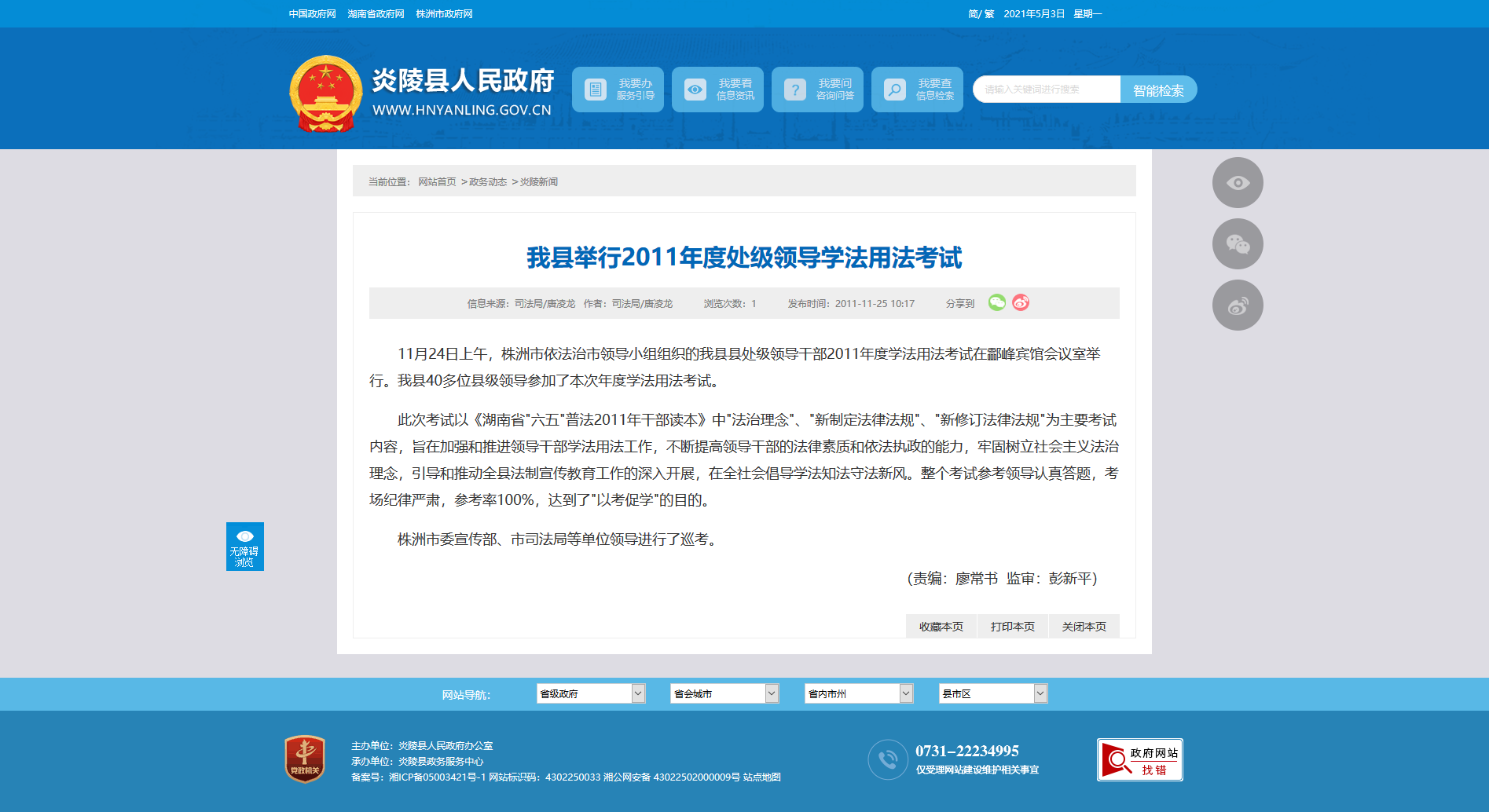 11月24日上午,株洲市依法治市领导小组组织的我县县处级领导干部2011年度学法用法考试在酃峰宾馆会议室举行。我县40多位县级领导参加了本次年度学法用法考试。