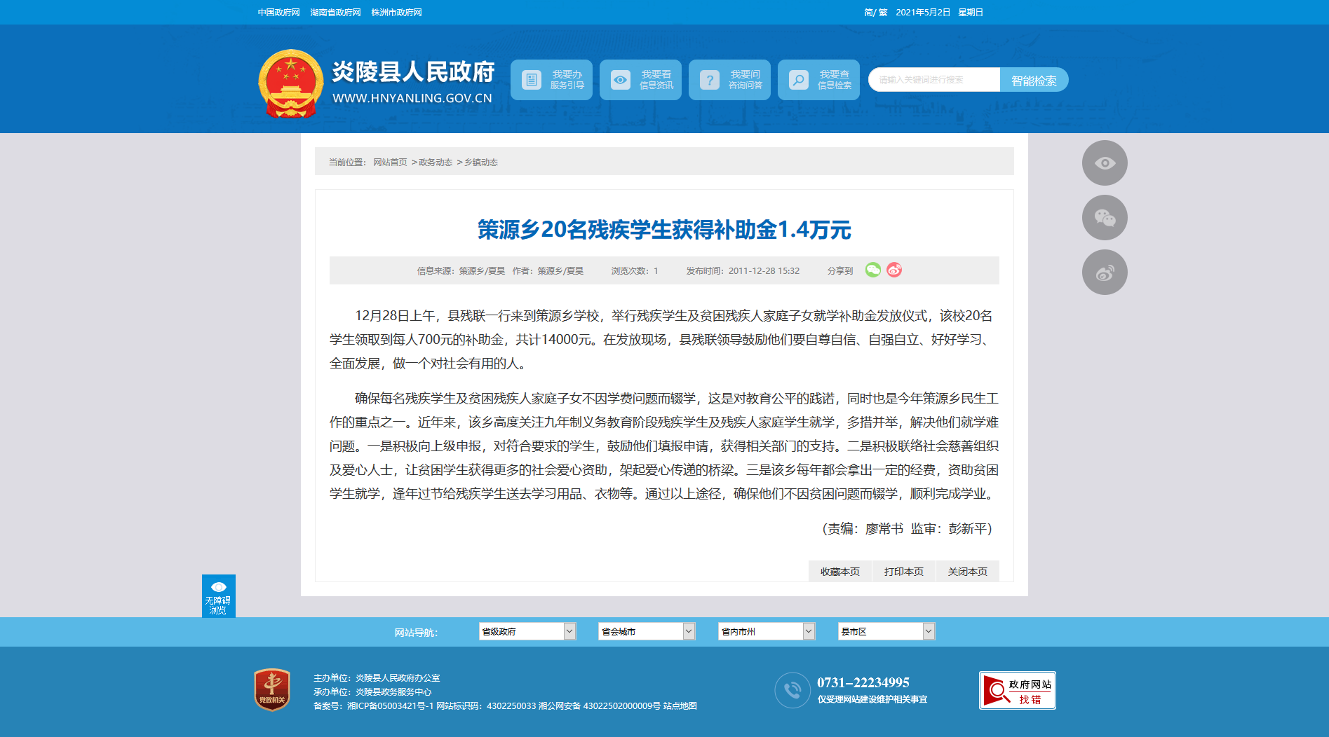 12月28日上午,县残联一行来到策源乡学校,举行残疾学生及贫困残疾人家庭子女就学补助金发放仪式,该校20名学生领取到每人700元的补助金,共计14000元。在发放现场,县残联领导鼓励他们要自尊自信、自强自立、好好学习、全面发展,做一个对社会有用的人。