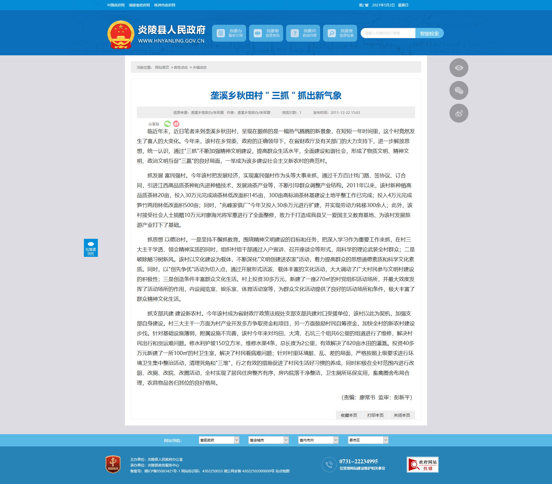 抓发展 富民强村。今年该村把发展经济,实现富民强村作为头等大事来抓,通过千方百计找门路、签协议、订合同,引进江西高品质茶种和先进种植技术,发展油茶产业等,不断引导群众调整产业结构。2011年以来,该村新种植高品质茶林20亩,投入30万元完成油茶林低改面积145亩,300亩高标油茶林基建设土地平整工作已完成;投入4万元完成笋竹两用林低改面积500亩;同时,"兆峰家俱厂"今年又投入30余万元进行扩建,并实现劳动力转移300余人;此外,该村接受社会人士捐赠10万元对廖海光将军墓进行了全面整修,致力于打造成我县又一爱国主义教育基地,为该村发展旅游产业打下了基础。
