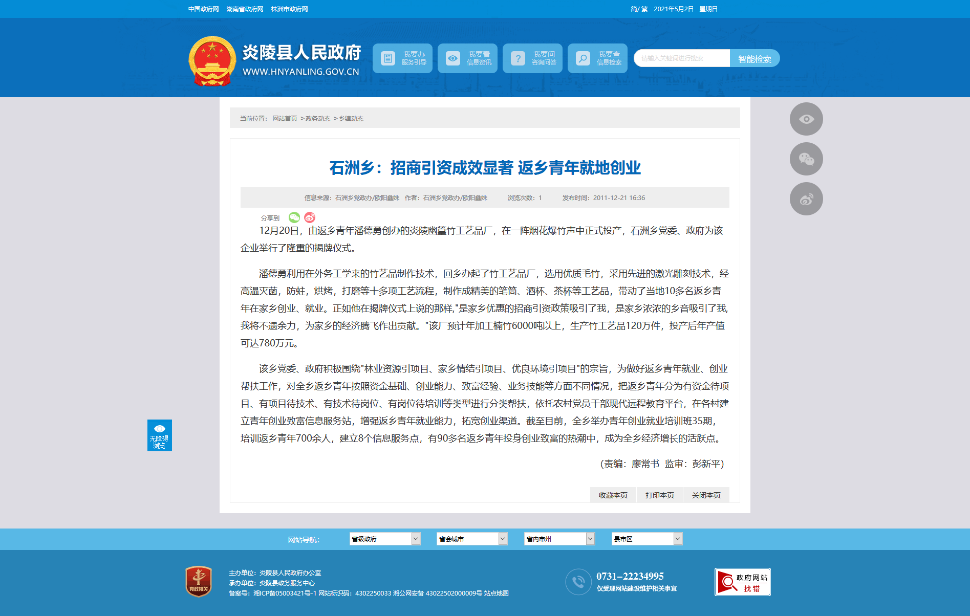 12月20日,由返乡青年潘德勇创办的炎陵幽篁竹工艺品厂,在一阵烟花爆竹声中正式投产,石洲乡党委、政府为该企业举行了隆重的揭牌仪式。