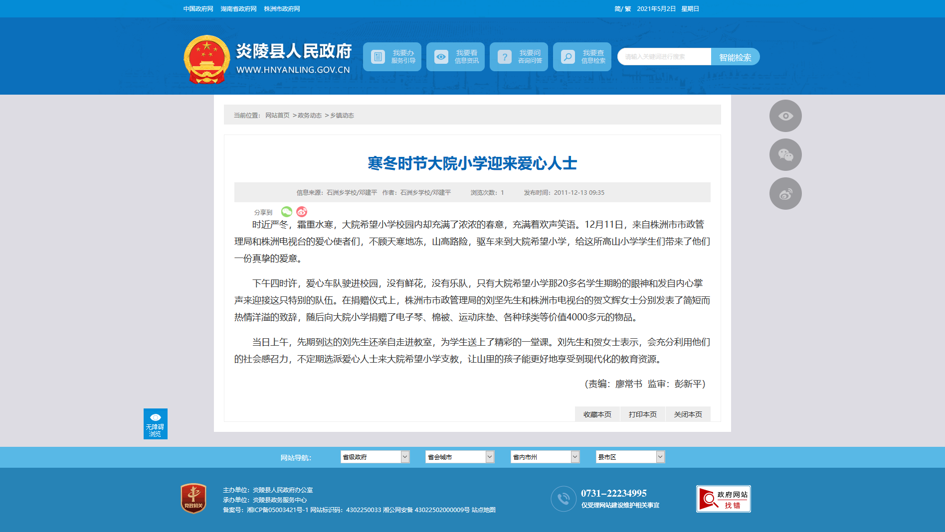 下午四时许,爱心车队驶进校园,没有鲜花,没有乐队,只有大院希望小学那20多名学生期盼的眼神和发自内心掌声来迎接这只特别的队伍。在捐赠仪式上,株洲市市政管理局的刘坚先生和株洲市电视台的贺文辉女士分别发表了简短而热情洋溢的致辞,随后向大院小学捐赠了电子琴、棉被、运动床垫、各种球类等价值4000多元的物品。