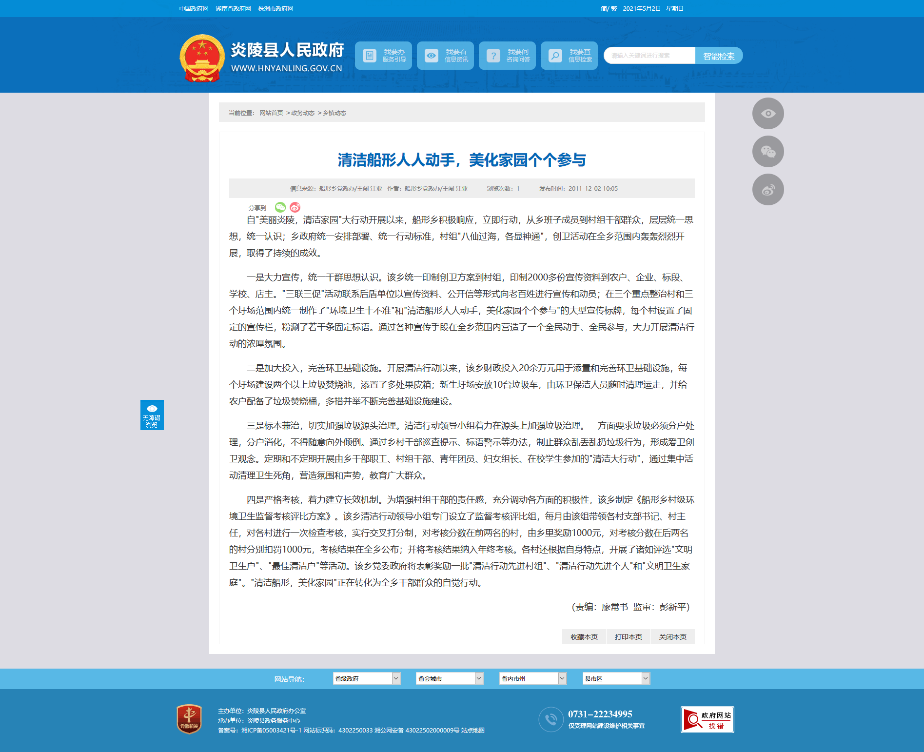 自"美丽炎陵,清洁家园"大行动开展以来,船形乡积极响应,立即行动,从乡班子成员到村组干部群众,层层统一思想,统一认识;乡政府统一安排部署、统一行动标准,村组"八仙过海,各显神通",创卫活动在全乡范围内轰轰烈烈开展,取得了持续的成效。