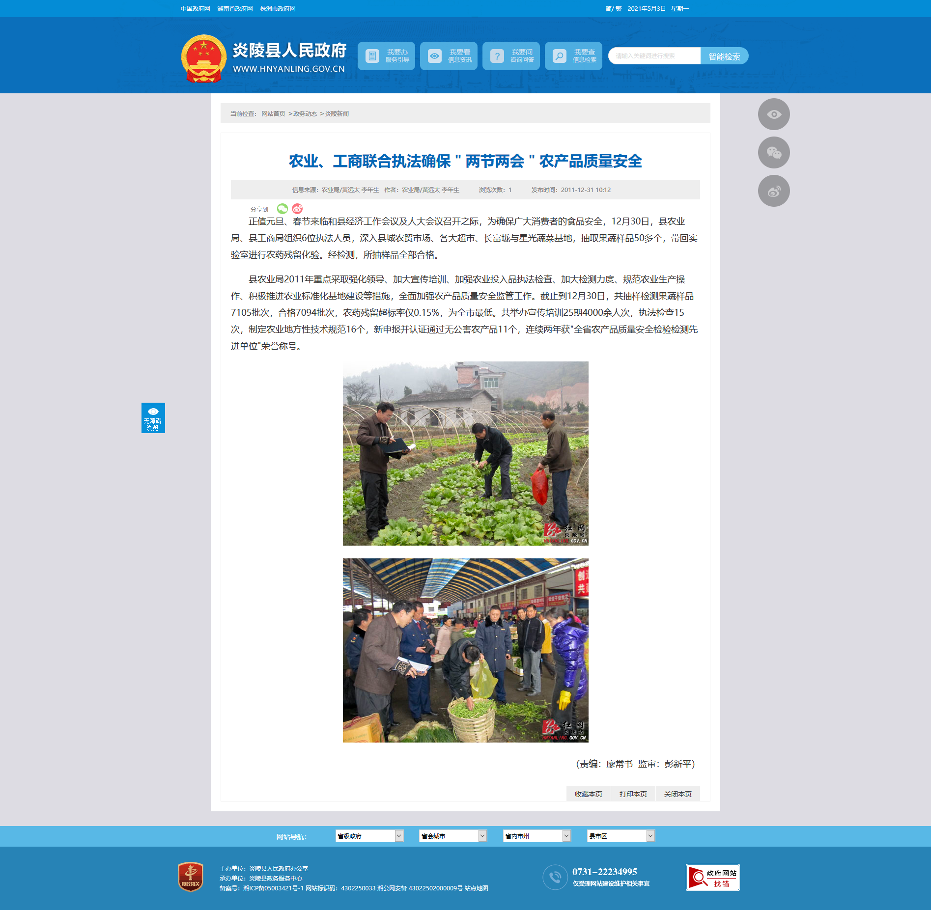县农业局2011年重点采取强化领导、加大宣传培训、加强农业投入品执法检查、加大检测力度、规范农业生产操作、积极推进农业标准化基地建设等措施,全面加强农产品质量安全监管工作。截止到12月30日,共抽样检测果蔬样品7105批次,合格7094批次,农药残留超标率仅0.15%,为全市最低。共举办宣传培训25期4000余人次,执法检查15次,制定农业地方性技术规范16个,新申报并认证通过无公害农产品11个,连续两年获"全省农产品质量安全检验检测先进单位"荣誉称号。