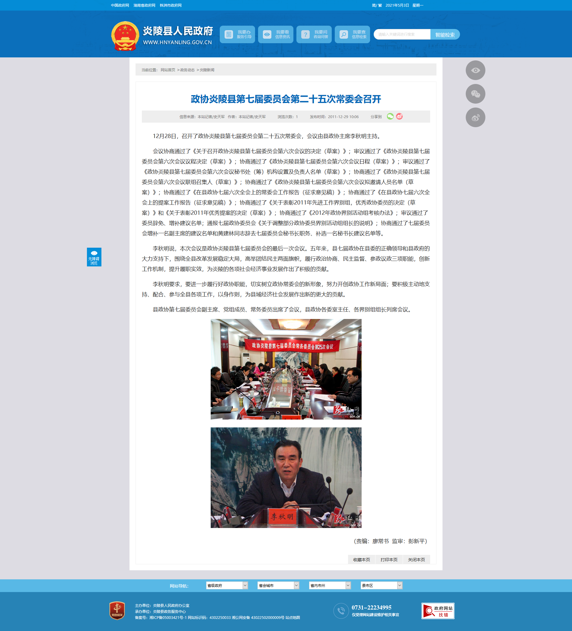 12月28日,召开了政协炎陵县第七届委员会第二十五次常委会,会议由县政协主席李秋明主持。
