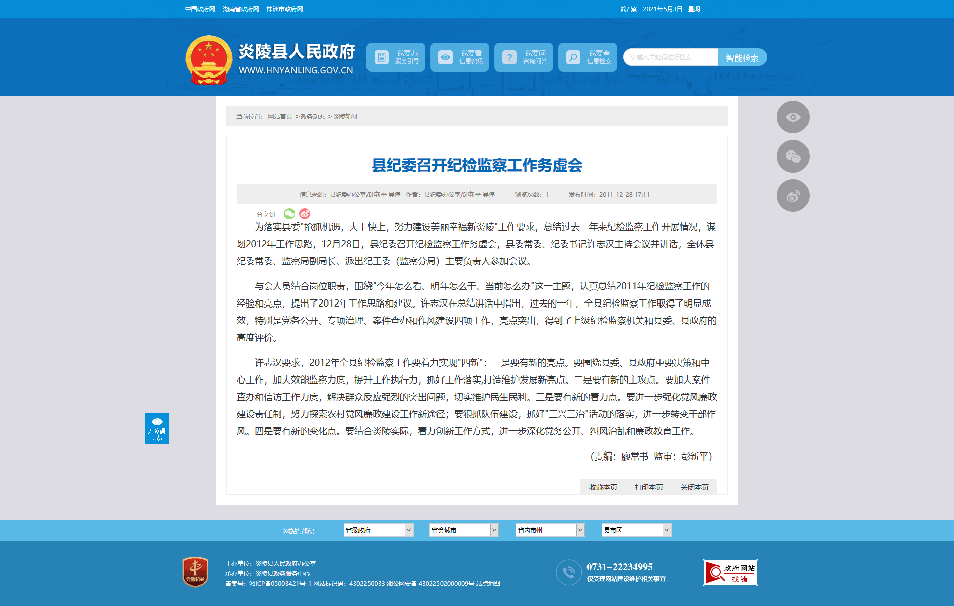 许志汉要求,2012年全县纪检监察工作要着力实现"四新":一是要有新的亮点。要围绕县委、县政府重要决策和中心工作,加大效能监察力度,提升工作执行力,抓好工作落实,打造维护发展新亮点。二是要有新的主攻点。要加大案件查办和信访工作力度,解决群众反应强烈的突出问题,切实维护民生民利。三是要有新的着力点。要进一步强化党风廉政建设责任制,努力探索农村党风廉政建设工作新途径;要狠抓队伍建设,抓好"三兴三治"活动的落实,进一步转变干部作风。四是要有新的变化点。要结合炎陵实际,着力创新工作方式,进一步深化党务公开、纠风治乱和廉政教育工作。