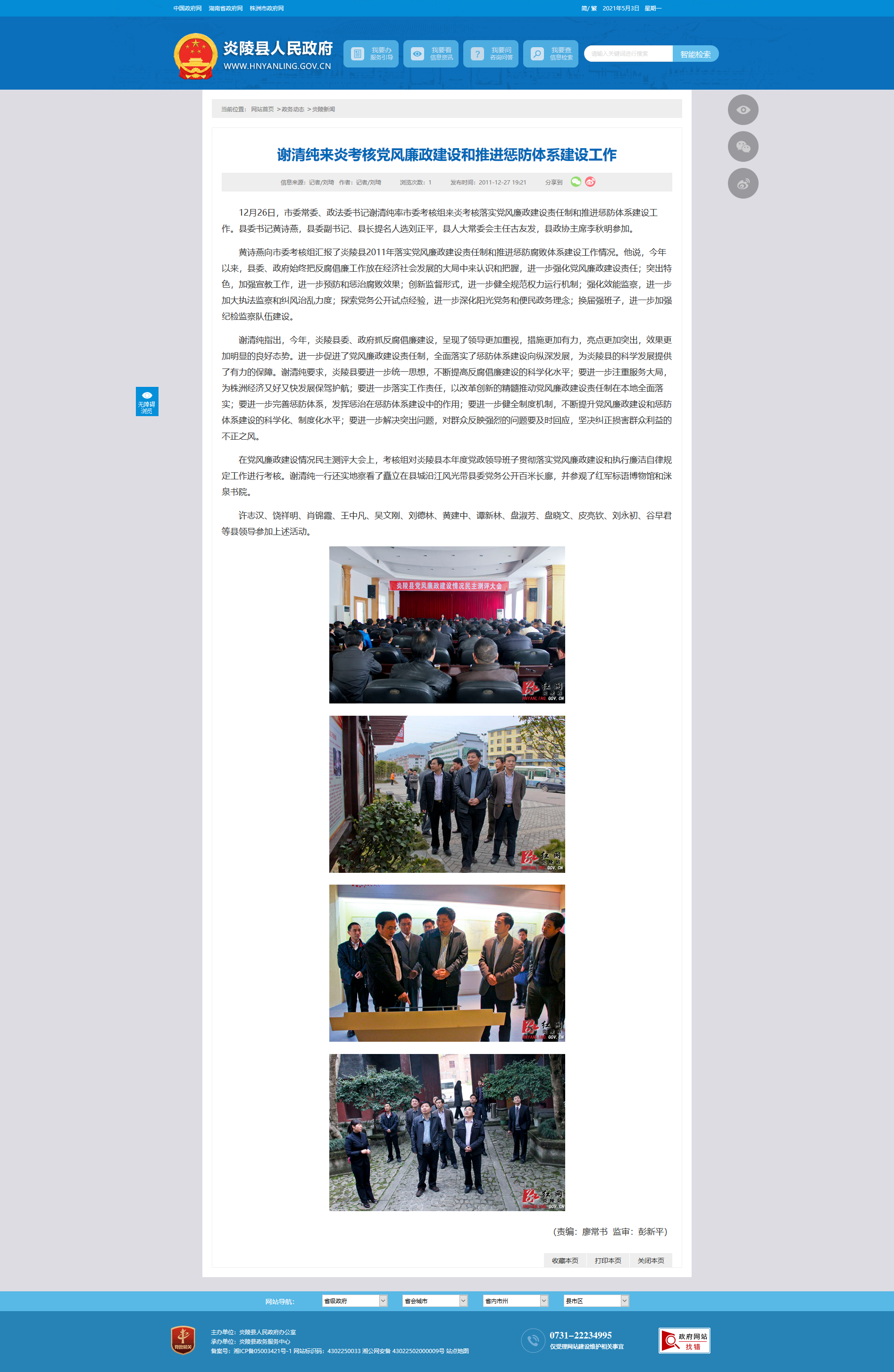 黄诗燕向市委考核组汇报了炎陵县2011年落实党风廉政建设责任制和推进惩防腐败体系建设工作情况。他说,今年以来,县委、政府始终把反腐倡廉工作放在经济社会发展的大局中来认识和把握,进一步强化党风廉政建设责任;突出特色,加强宣教工作,进一步预防和惩治腐败效果;创新监督形式,进一步健全规范权力运行机制;强化效能监察,进一步加大执法监察和纠风治乱力度;探索党务公开试点经验,进一步深化阳光党务和便民政务理念;换届强班子,进一步加强纪检监察队伍建设。