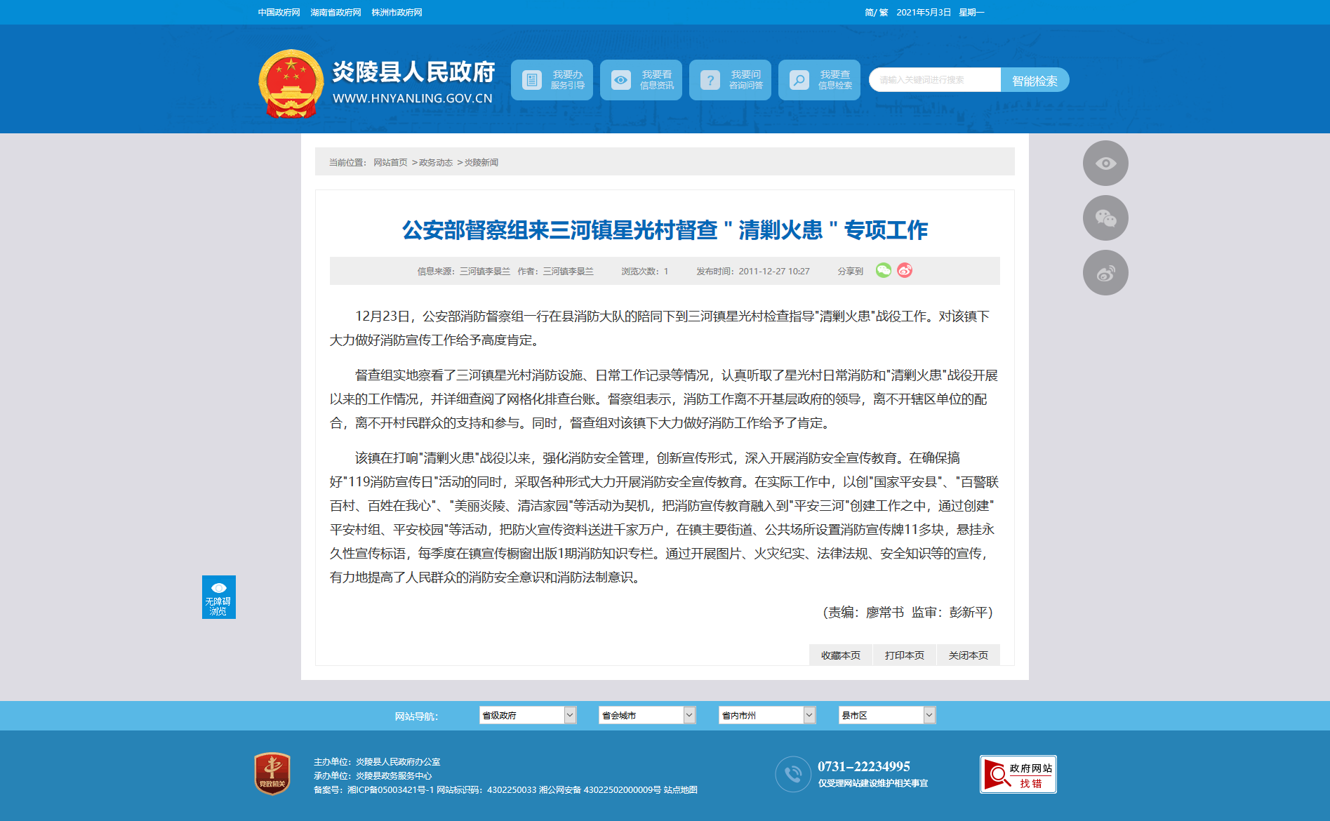该镇在打响"清剿火患"战役以来,强化消防安全管理,创新宣传形式,深入开展消防安全宣传教育。在确保搞好"119消防宣传日"活动的同时,采取各种形式大力开展消防安全宣传教育。在实际工作中,以创"国家平安县"、"百警联百村、百姓在我心"、"美丽炎陵、清洁家园"等活动为契机,把消防宣传教育融入到"平安三河"创建工作之中,通过创建"平安村组、平安校园"等活动,把防火宣传资料送进千家万户,在镇主要街道、公共场所设置消防宣传牌11多块,悬挂永久性宣传标语,每季度在镇宣传橱窗出版1期消防知识专栏。通过开展图片、火灾纪实、法律法规、安全知识等的宣传,有力地提高了人民群众的消防安全意识和消防法制意识。