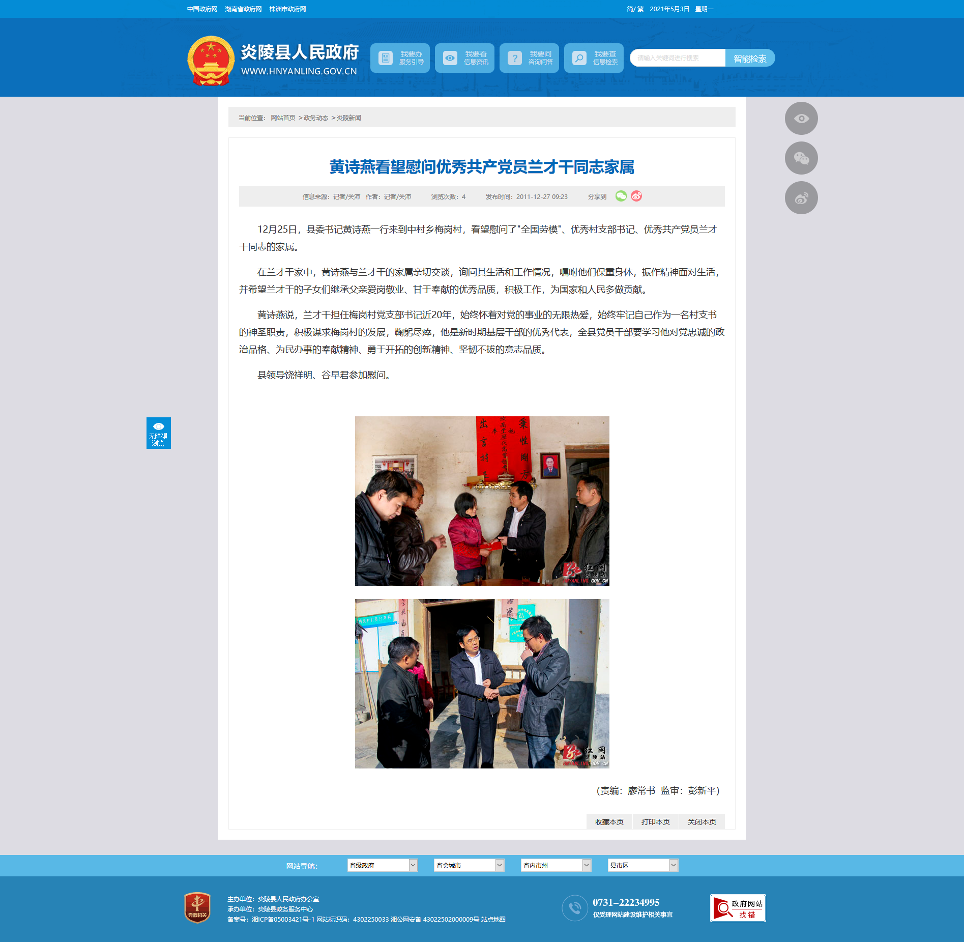 12月25日,县委书记黄诗燕一行来到中村乡梅岗村,看望慰问了"全国劳模"、优秀村支部书记、优秀共产党员兰才干同志的家属。