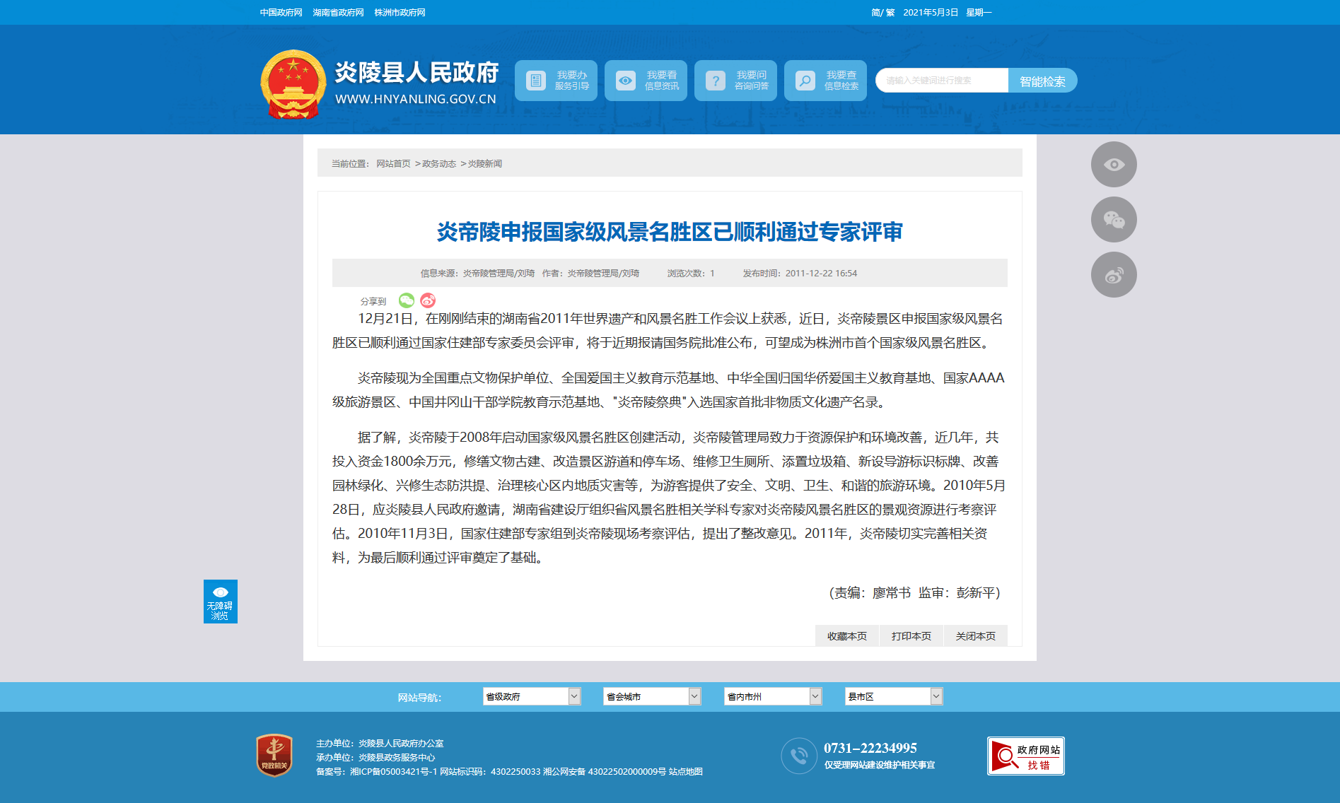 据了解,炎帝陵于2008年启动国家级风景名胜区创建活动,炎帝陵管理局致力于资源保护和环境改善,近几年,共投入资金1800余万元,修缮文物古建、改造景区游道和停车场、维修卫生厕所、添置垃圾箱、新设导游标识标牌、改善园林绿化、兴修生态防洪提、治理核心区内地质灾害等,为游客提供了安全、文明、卫生、和谐的旅游环境。2010年5月28日,应炎陵县人民政府邀请,湖南省建设厅组织省风景名胜相关学科专家对炎帝陵风景名胜区的景观资源进行考察评估。2010年11月3日,国家住建部专家组到炎帝陵现场考察评估,提出了整改意见。2011年,炎帝陵切实完善相关资料,为最后顺利通过评审奠定了基础。
