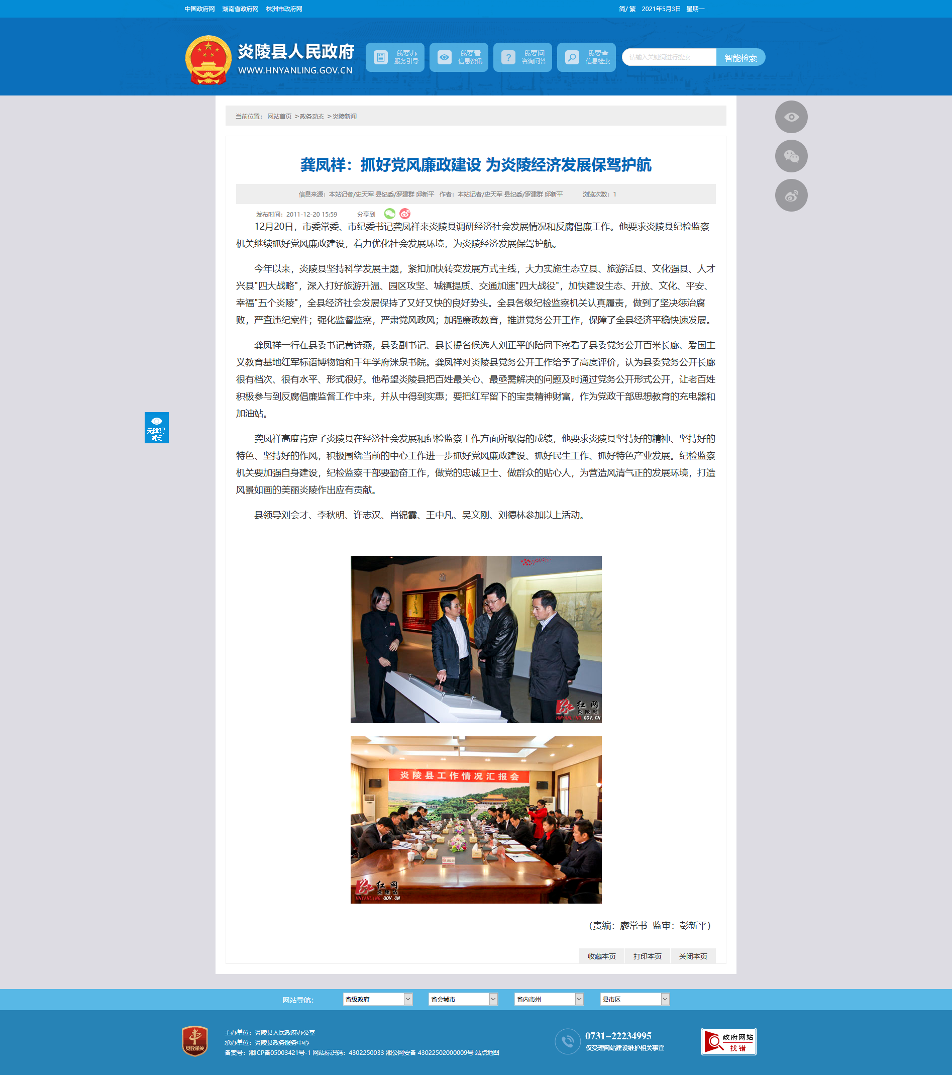 12月20日,市委常委、市纪委书记龚凤祥来炎陵县调研经济社会发展情况和反腐倡廉工作。他要求炎陵县纪检监察机关继续抓好党风廉政建设,着力优化社会发展环境,为炎陵经济发展保驾护航。