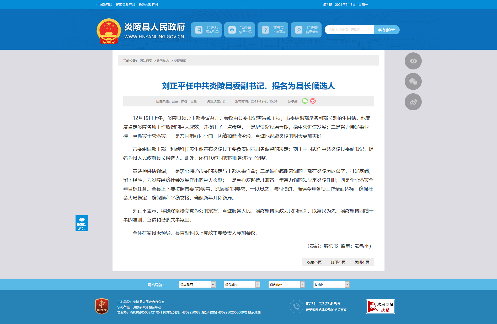 市委组织部干部一科副科长黄生湘宣布炎陵县主要负责同志职务调整的决定:刘正平同志任中共炎陵县委副书记,提名为县人民政府县长候选人。此外,还有10位同志的职务进行了调整。