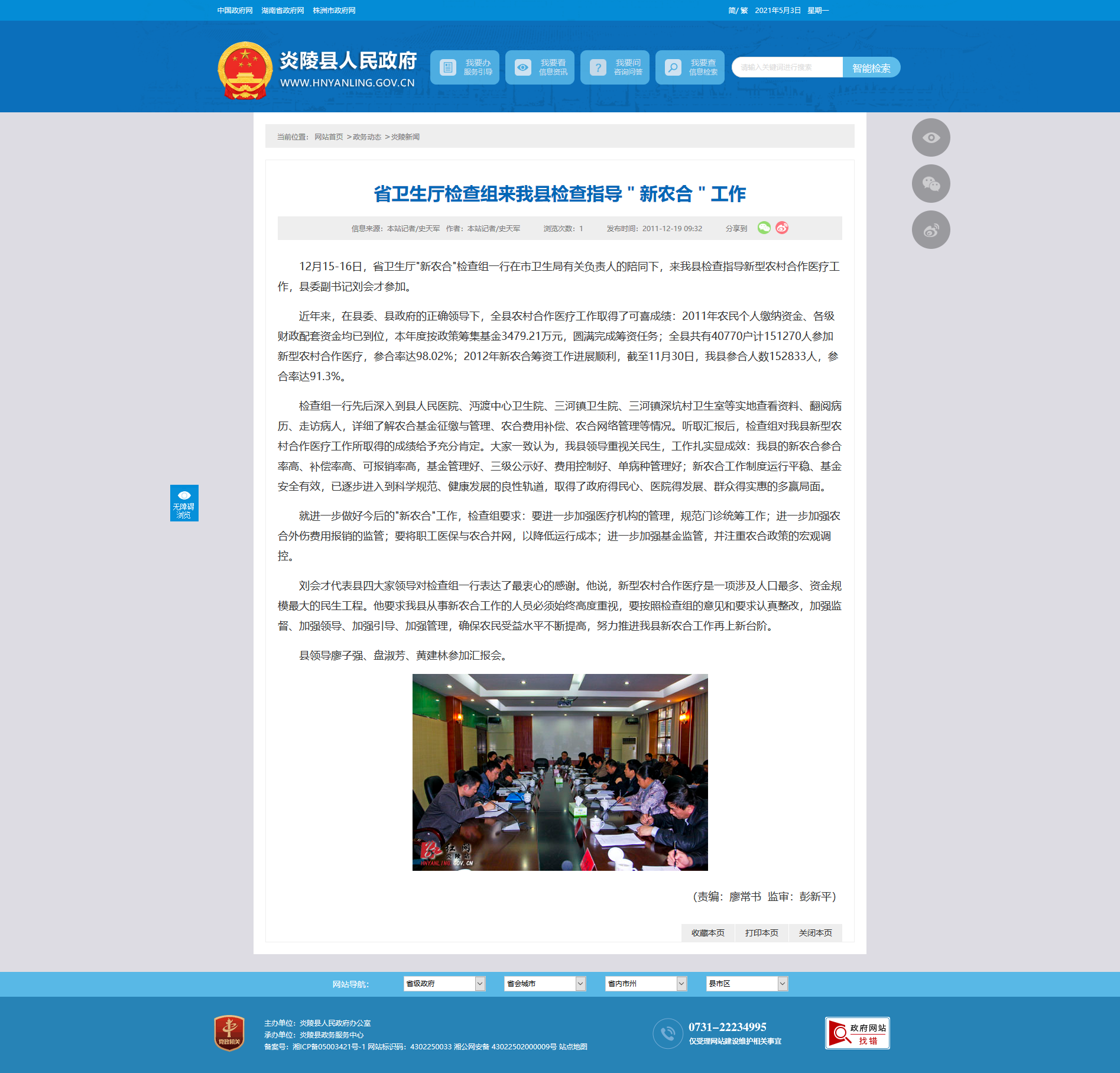 12月15-16日,省卫生厅"新农合"检查组一行在市卫生局有关负责人的陪同下,来我县检查指导新型农村合作医疗工作,县委副书记刘会才参加。