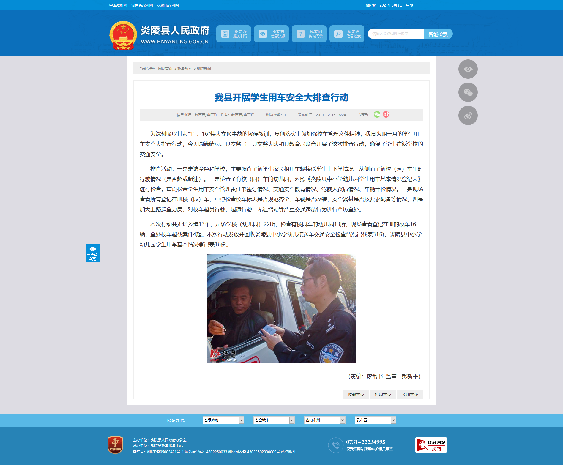 排查活动:一是走访乡镇和学校,主要调查了解学生家长租用车辆接送学生上下学情况、从侧面了解校(园)车平时行驶情况(是否超载超速)。二是检查了有校(园)车的幼儿园,对照《炎陵县中小学幼儿园学生用车基本情况登记表》进行检查,重点检查学生用车安全管理责任书签订情况、交通安全教育情况、驾驶人资质情况、车辆年检情况。三是现场查看所有登记在册校(园)车,重点检查校车标志是否规范齐全、车辆是否改装、安全器材是否按要求配备等情况。四是加大上路巡查力度,对校车超员行驶、超速行驶、无证驾驶等严重交通违法行为进行严厉查处。