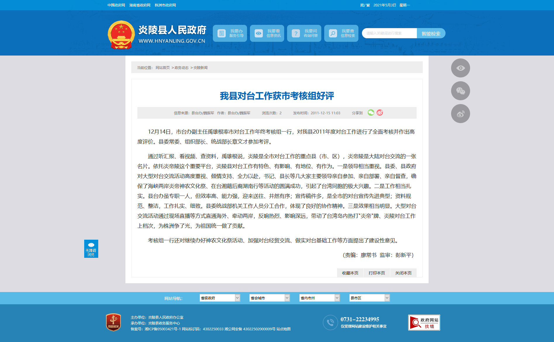 通过听汇报、看视频、查资料,禹雄根说,炎陵是全市对台工作的重点县(市、区),炎帝陵是大陆对台交流的一张名片。依托炎帝陵这个重要平台,炎陵县对台工作有特色、有影响、有地位、有作为。一是领导相当重视。县委、县政府对大型对台交流活动高度重视、倾情支持、全力以赴,书记、县长等几大家主要领导亲自参加、亲自部署、亲自督查,确保了海峡两岸炎帝神农文化祭、在台湘籍后裔湖南行等活动的圆满成功,引起了台湾同胞的极大兴趣。二是工作相当扎实。县台办虽专职一人,但效率高、能力强,迎来送往、井然有序;宣传稿件多,是全市的对台宣传先进典型;资料规范、整洁,工作扎实、细致。县委统战部机关工作人员分工合作,体现了良好的协作精神。三是效果相当明显。大型对台交流活动通过现场直播等方式直通海外、牵动两岸,反响热烈、影响深远,带动了台湾岛内热打"炎帝"牌、炎陵对台工作上档次,为株洲争了光,为祖国统一做了贡献。